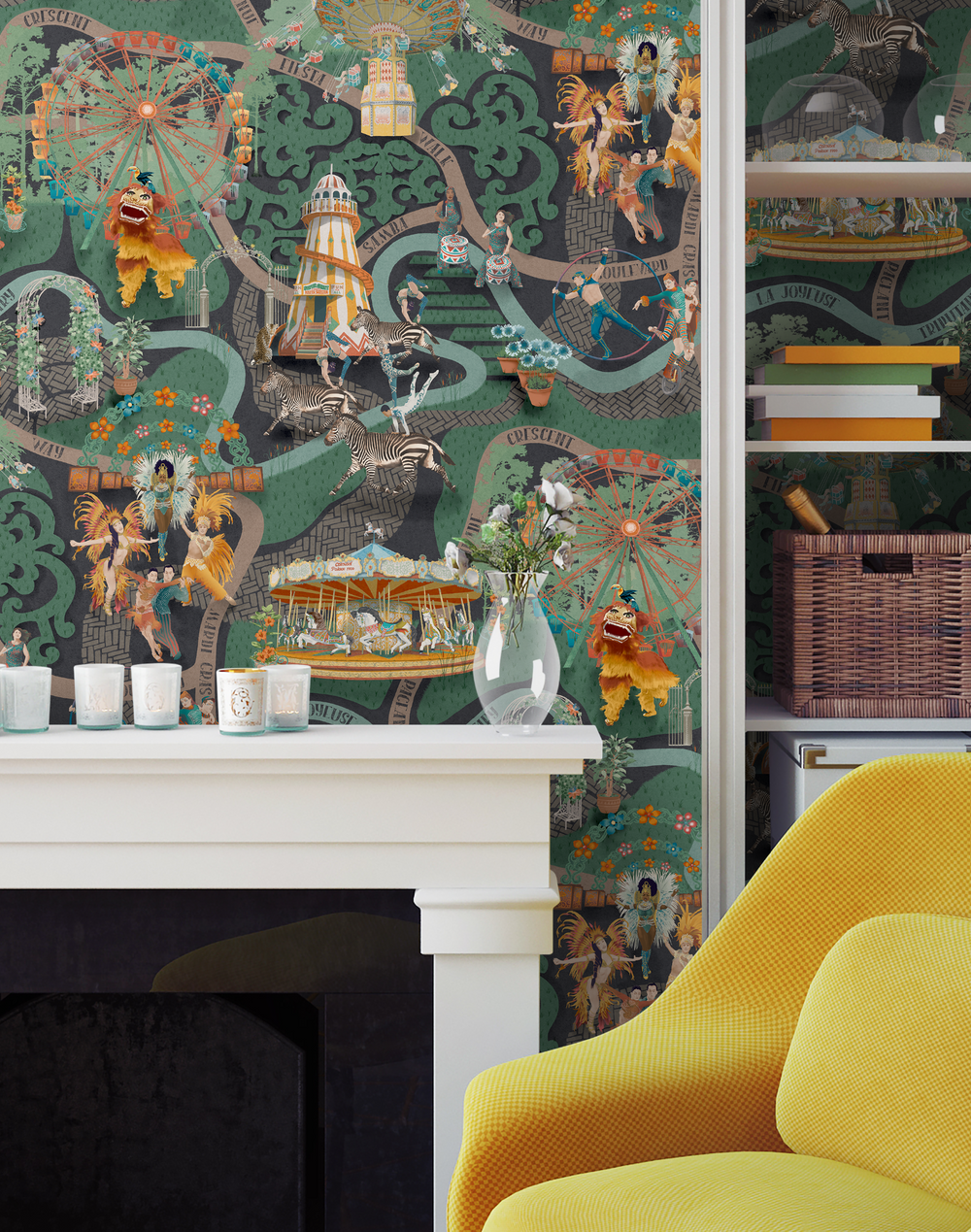Carnival Map wallpaper by Brand McKenzie, a dynamic and captivating design that features a detailed map of a carnival, complete with acrobats, a merry-go-round, a helter-skelter, gardens and many other intricate and enticing activities. Perfect for those who love to add a touch of whimsy and adventure to their decor, this playful wallpaper invites you to get lost in the magic and excitement of the carnival. Transform any room into a captivating wonderland with Carnival Map wallpaper.
