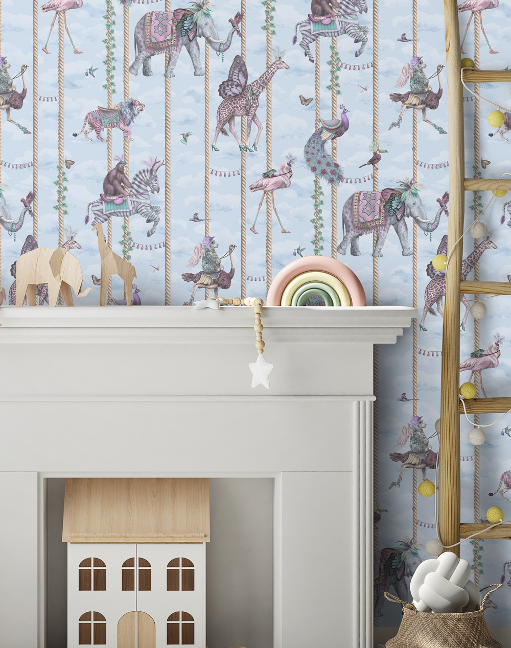 Carousel wallpaper by Brand McKenzie, a stunning design that features a collection of fantastic animals, including a giraffe, elephant, monkey, and zebra, riding around a vibrant carousel. The whimsical and playful design is accentuated by a variety of backgrounds, making it perfect for those looking to add a touch of enchantment to any space. Create a captivating and imaginative atmosphere in your home or office with Carousel wallpaper by Brand McKenzie.