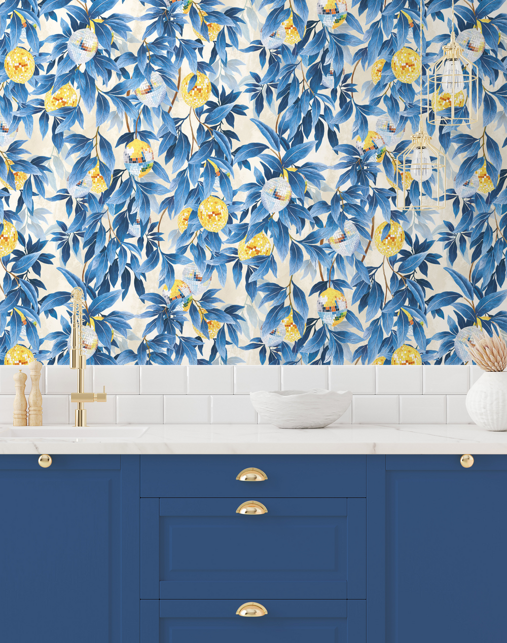 Disco Lemons, a vibrant and surprising wallpaper pattern that blends nature and nightlife, will give your interiors a new look.