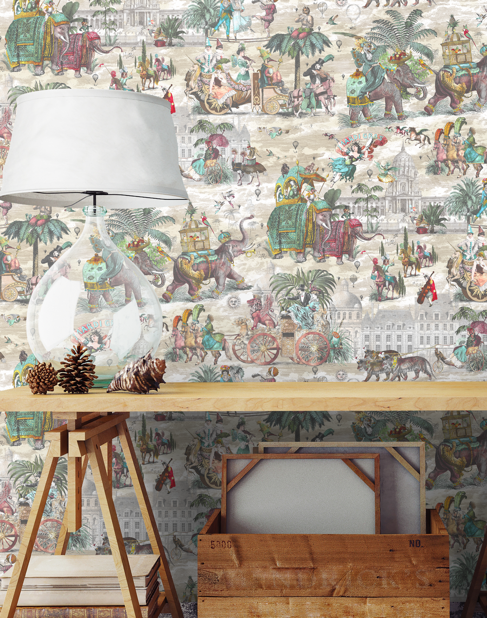 Fiesta wallpaper by Brand McKenzie, a vibrant and playful design that captures the excitement and energy of a carnival coming to town. With majestic elephants and other exotic animals marching in front of grand buildings, and the sound of music filling the air, this wallpaper transports you to a world of vibrant colors and whimsical imagery. The hot air balloons, clouds and sun in the sky add to the playful atmosphere, making Fiesta wallpaper the perfect choice for those looking to add some fun and personality to their space.