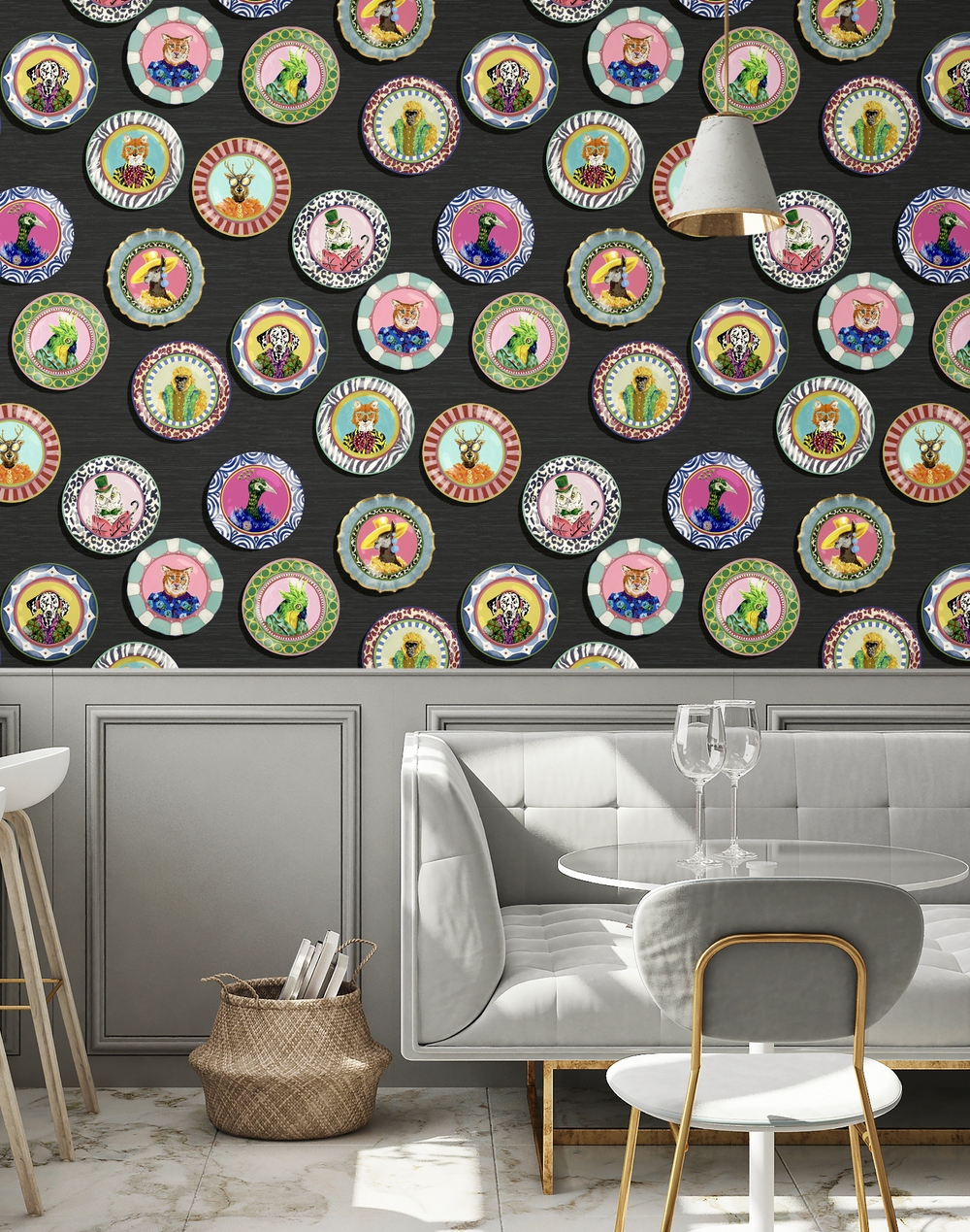 Introducing our whimsical collection of side plates, where animal prints and patterns take center stage, showcasing animals dressed for dinner in eccentric style outfits that include a gorilla in a fur coat and a fox sporting glasses and a neck scarf, adding a touch of playful charm to your dining experience.
