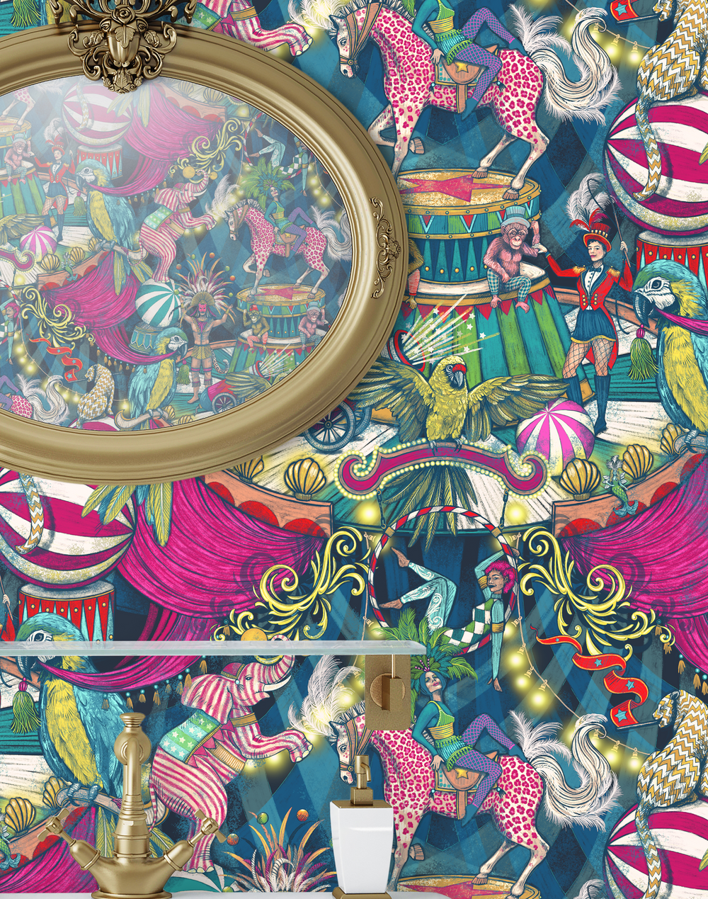 Introducing Funfair wallpaper by Brand McKenzie, a vibrant and whimsical design that announces the arrival of the carnival in town. Featuring a playful ringmaster, a colorful parrot, and a variety of other recognizable animals cleverly disguised in vibrant patterns, this wallpaper captures the excitement and fun of the carnival. The colorful and bold design is perfect for those looking to add some personality and charm to any space. Bring the magic of the carnival into your home or office with Funfair wallpaper by Brand McKenzie.