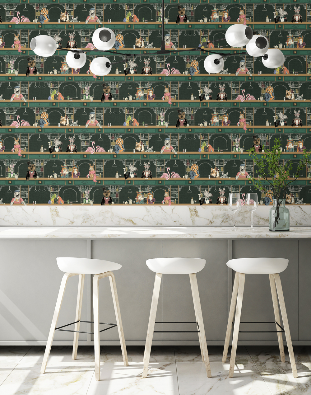Introducing the luxurious and playful Happy Hour wallpaper by Brand McKenzie. A cocktail bar where animals such as lions, parrots, dogs, and flamingos dress up as humans and indulge in a delightful drink. This exquisite wallpaper perfectly captures the essence of luxury and fun, bringing a touch of playfulness to any room. Perfect for cocktail lovers and animal enthusiasts alike, Happy Hour adds a sense of whimsy and charm to your walls. Transform your space with this stunning and unique design today.