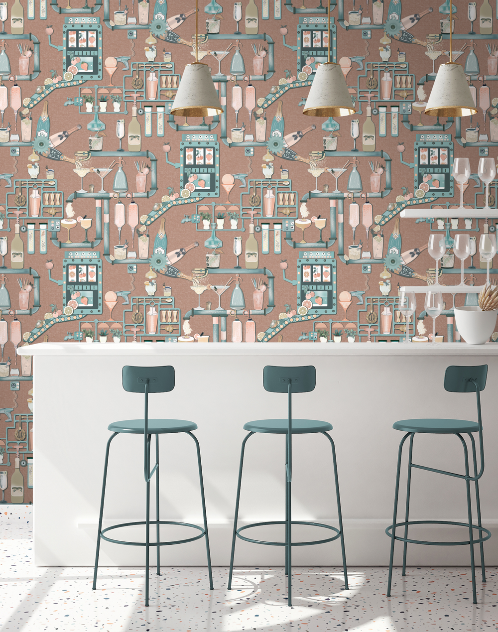 With Liquid Lab, a quirky wallpaper that transforms your walls into a cocktail-making paradise, you can enter a whimsical world where science and mixology collide. It portrays the allure of a future beverages lab with its lab-inspired devices, drink dispensers, slot machines, and boiling flasks.
