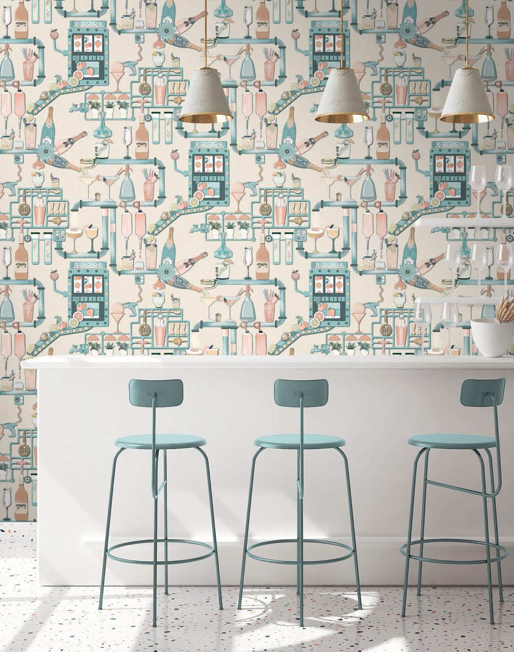 With Liquid Lab, a quirky wallpaper that transforms your walls into a cocktail-making paradise, you can enter a whimsical world where science and mixology collide. It portrays the allure of a future beverages lab with its lab-inspired devices, drink dispensers, slot machines, and boiling flasks.
