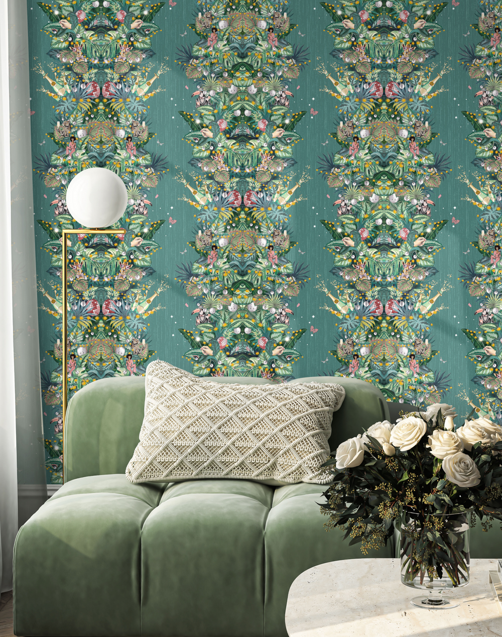 Every square inch of this wallpaper is brimming with narrative: champagne is sipped by relaxing figures, pineapples gleam like jewels, and mystical touches and whimsical motifs are hidden by vegetation.