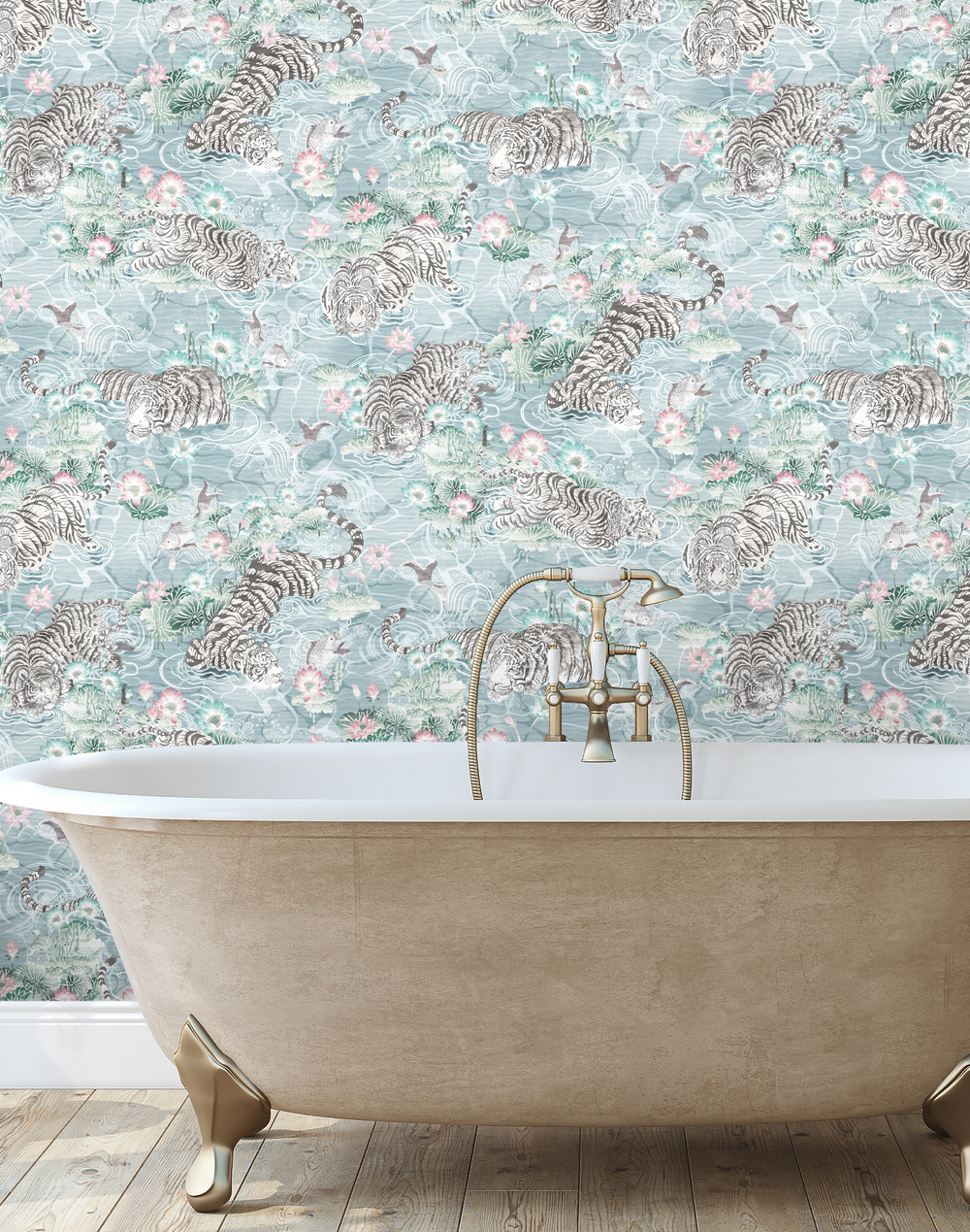 Immerse yourself in the enchanting world where beautiful, elegant tigers prowl, creating ripples in the water surrounded by lily pads and flowers, while flying fish make a splash. This brings to life a harmonious blend of grace and nature's vibrant beauty.