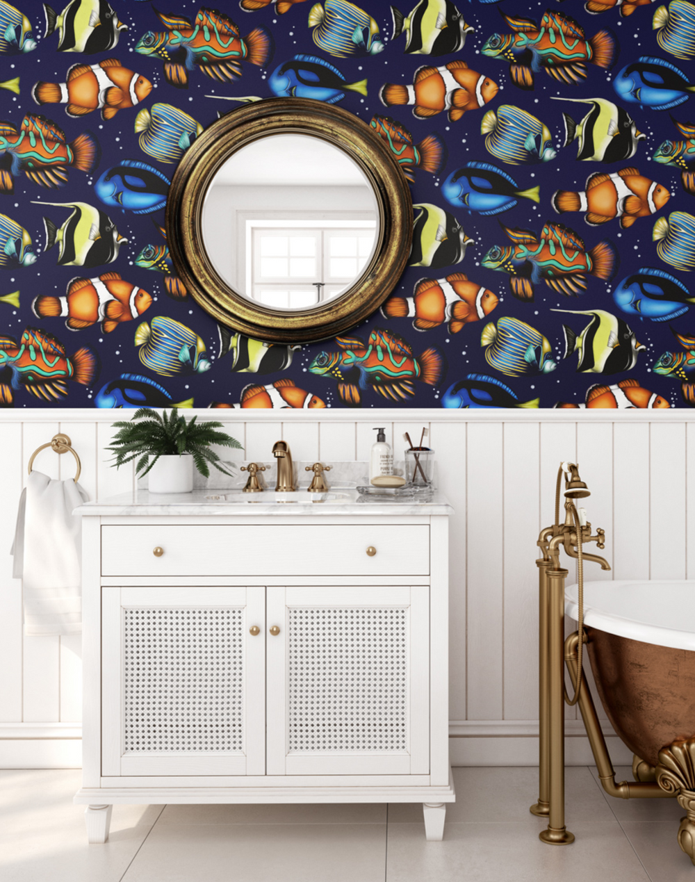 This enchanting design submerges you deep beneath the ocean water, giving you a glimpse of the fascinating world in the depths of the deep sea. Our tropical fish design uses vibrant splashes of beautiful colors and paired with a rich dark blue background, will certainly immerse you in the mysterious depths of the ocean floor. Our detailed design would be the perfect addition to your bathroom or downstairs cloakroom and will certainly bring a tropical twist to your interiors.