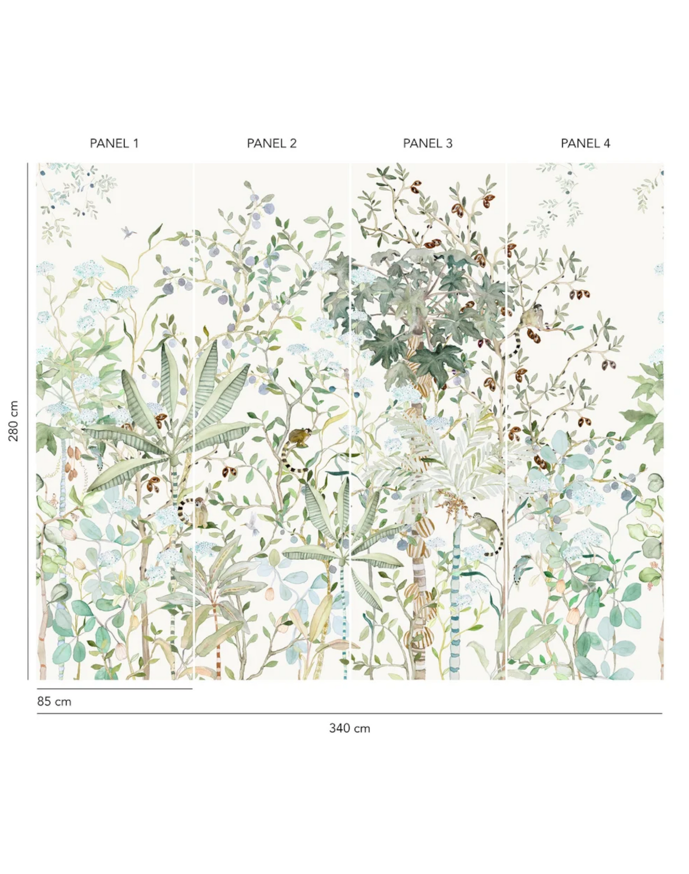 Our new timeless classic, this panoramic wallpaper captures the soul of the Atlantic forest in Brazil’s Southern Coast line with graceful botanical detail. Tropicalia panoramic wallpaper is a vibrant Chinoiserie-inspired design featuring lush Brazilian flora, tropical fruits, and playful monkeys hidden among exotic flowers. Add a whimsical, joyful touch to your walls with this lively botanical mural.