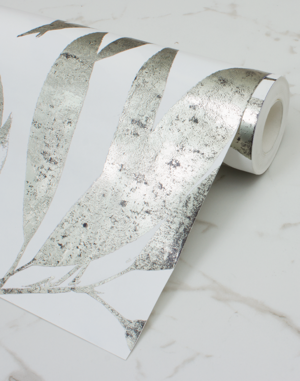 Rye features bold oversized leaves, complementing the bestselling metallic Columbia Road design of large eucalyptus stems. Inspired by the Barbican Conservatory in London Rye offers an elegant and rich composition in copper, using CUSTHOM’s hand foiled finish. The repeating pattern fills the space with meandering branches, the metallic finish of the leaves catching the light and casting it back into the room. Printed on to durable non-woven FSC certified wallpaper.