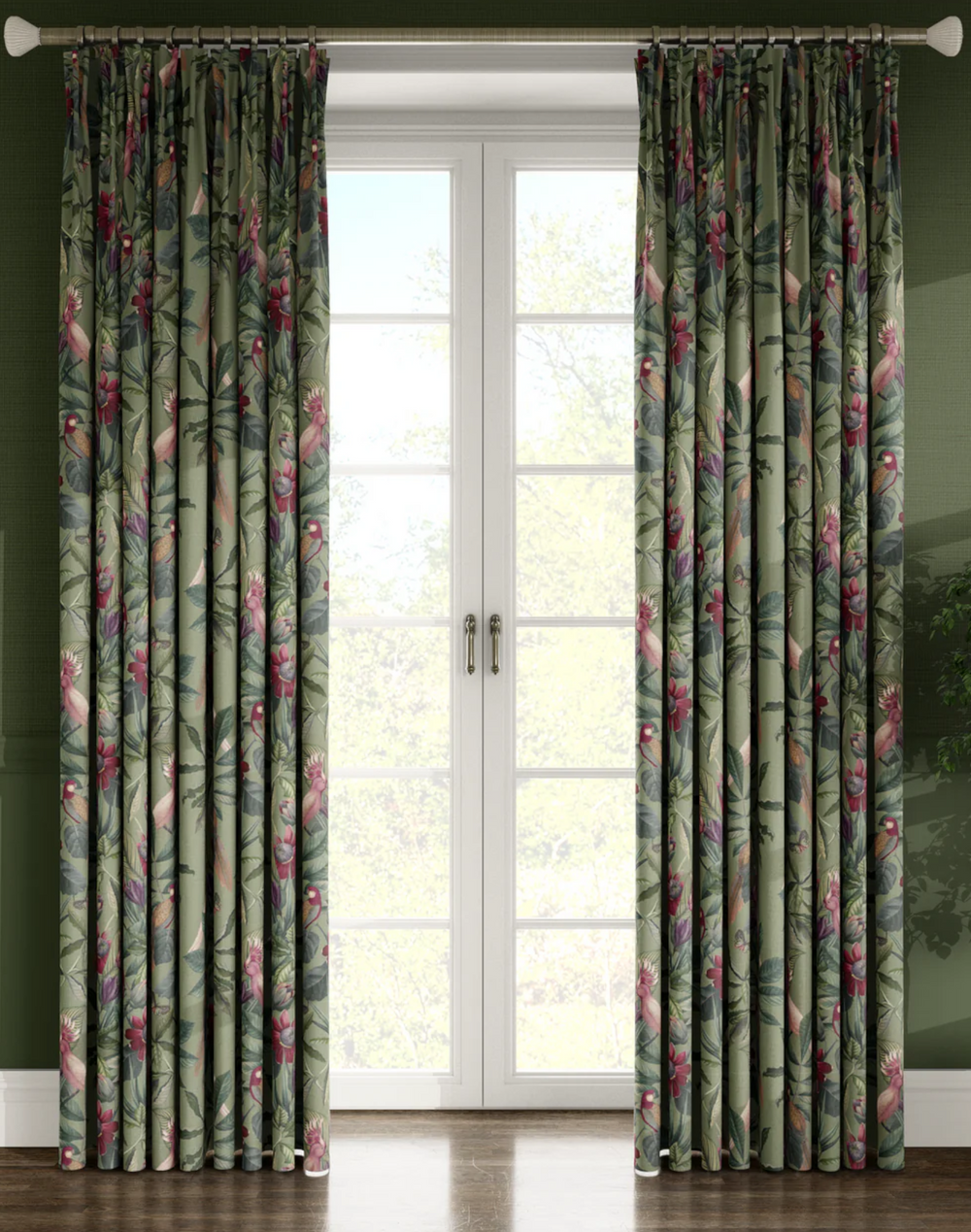 The Passiflora Collection is a wild and tropical labyrinth. Inspired by the Colombian rainforest, the detailed birds and butterflies are surrounded by oversized ferns deep in the tropics. The bold design is a large canopy creating a pattern that lures you into the South American jungle. Available in four colors, Ammonite, Antique, Sage and Vardo.