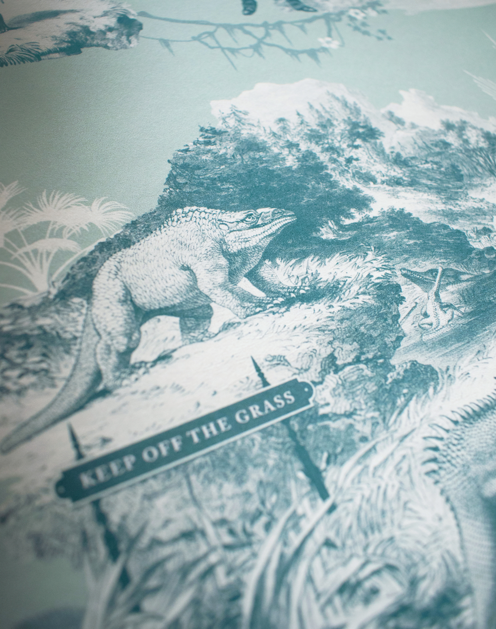 Taking inspiration from Benjamin Waterhouse Hawkin’s elaborate Victorian theme park at Crystal Palace, South-East London. Featuring a plethora of prehistoric beasts as they skulk in the bushes and frolic in the water, you’ll also notice the Victorians of the time as they wander through their Jurassic fantasy world. This detail-rich, large scale wallpaper will bring an artful ambiance to any interior.
