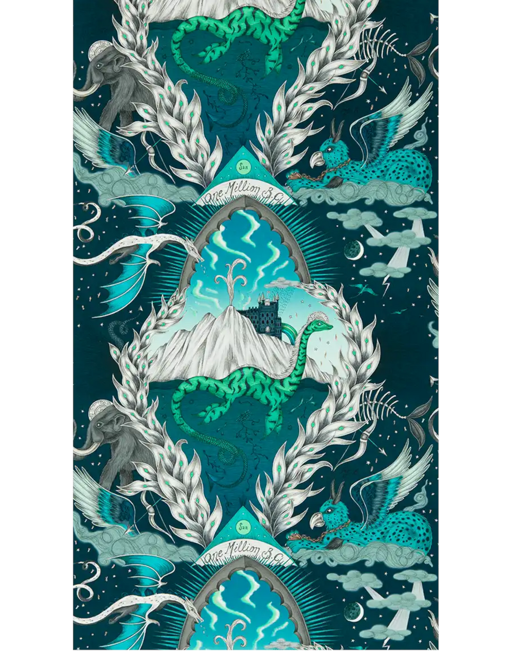Dragons twist their tails as they fly through a starry sky. See a mammoth, a winged griffin, or the Loch Ness monster. A Scottish turreted castle can be seen in the background, while clouds gather, flames whirl, lightning strikes, and bows and arrows fly overhead. This digitally printed wallpaper displays the Highlandia pattern in all its splendor, and here are just a few of its captivating features. A fanciful Scottish landscape emerges, imaginative and emotive, ideal for daring interior design.