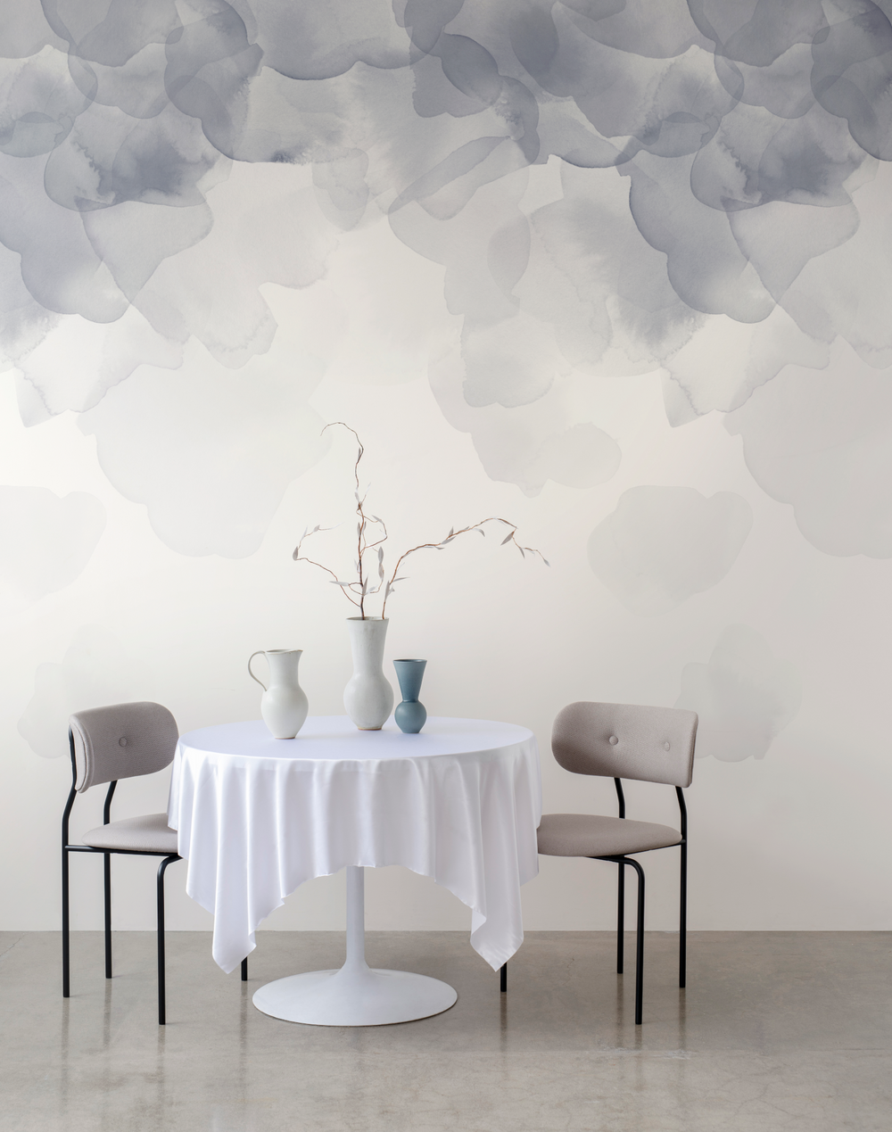 Layers of hand-painted watercolor flow across the paper, designed to bring restfulness to a room, adding a delicate and decorative touch.