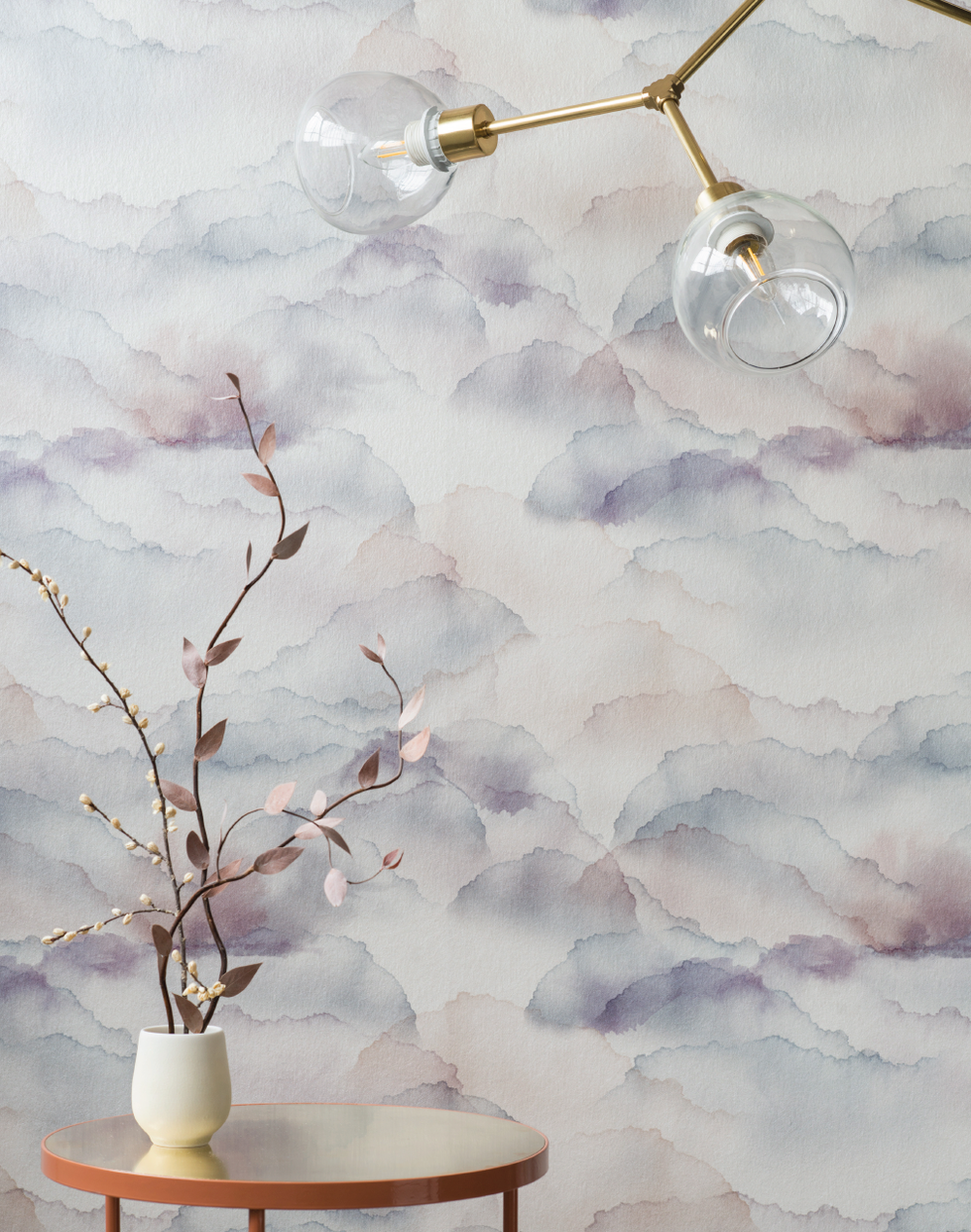 Layers of hand-painted watercolor flow across the paper, designed to bring restfulness to a room, adding a delicate and decorative touch.