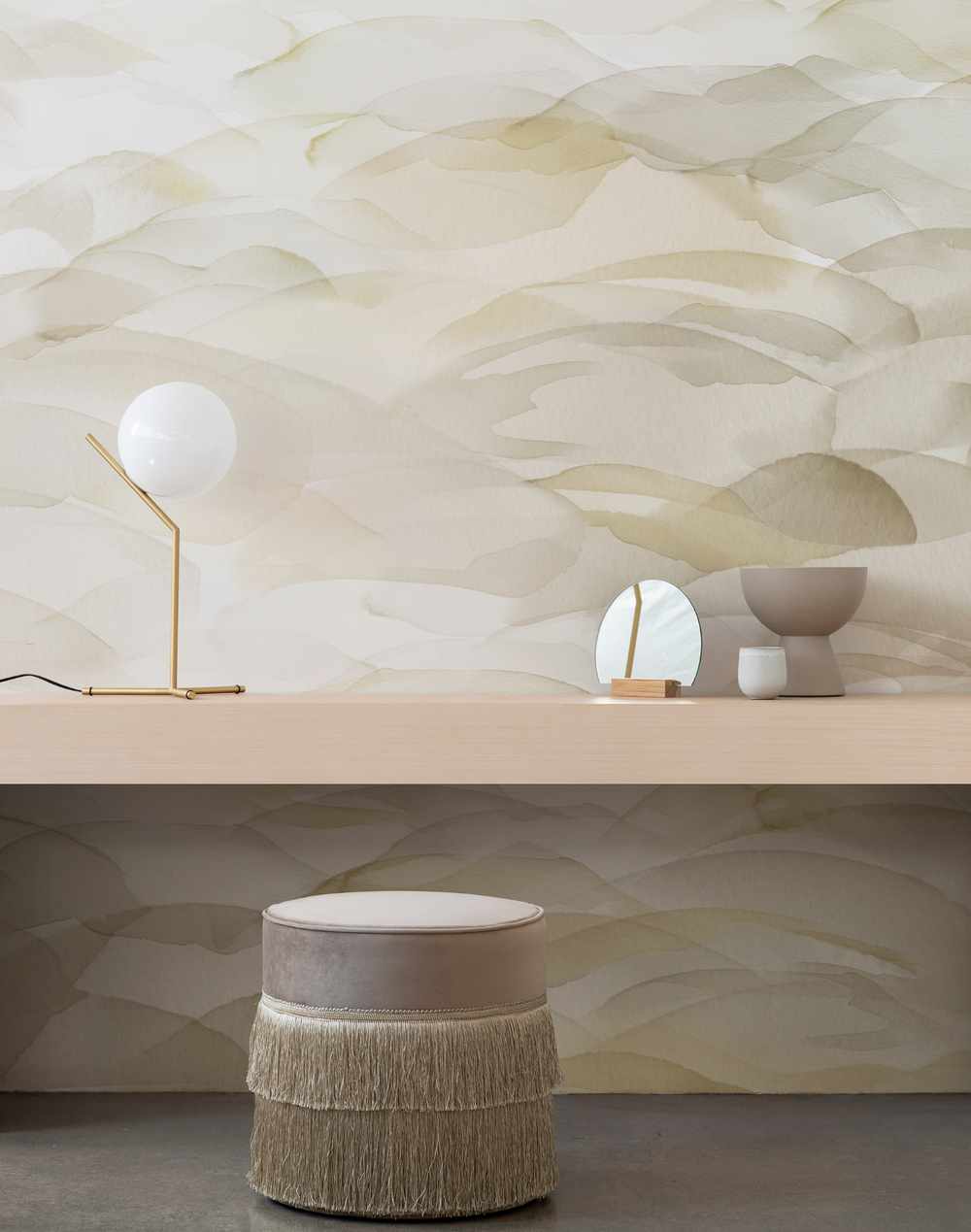 Layers of hand-painted watercolor flow across the paper, designed to bring restfulness to a room, adding a delicate and decorative touch.
