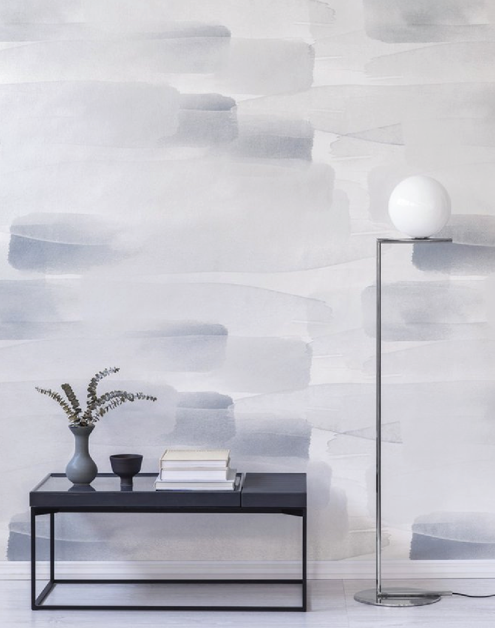 The fluid and languid River print is reproduced on a wide width low gloss surface wallpaper. Layers of hand-painted watercolor flow across the paper, designed to bring restfulness to a room, adding a delicate and decorative touch.