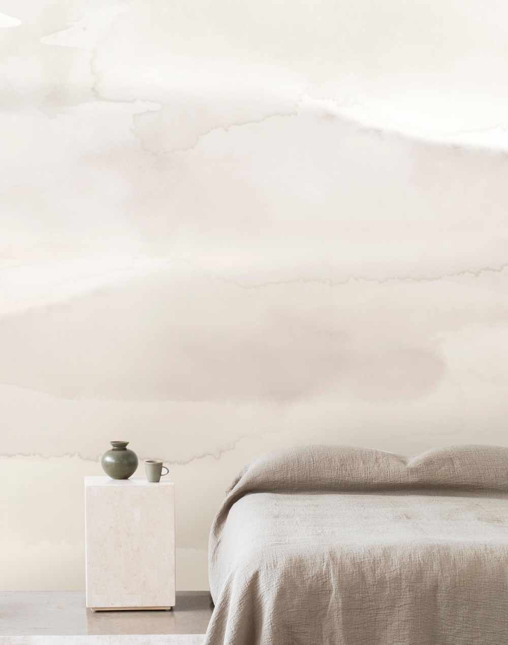 Layers of hand-painted watercolor flow across the paper, designed to bring restfulness to a room, adding a delicate and decorative touch.