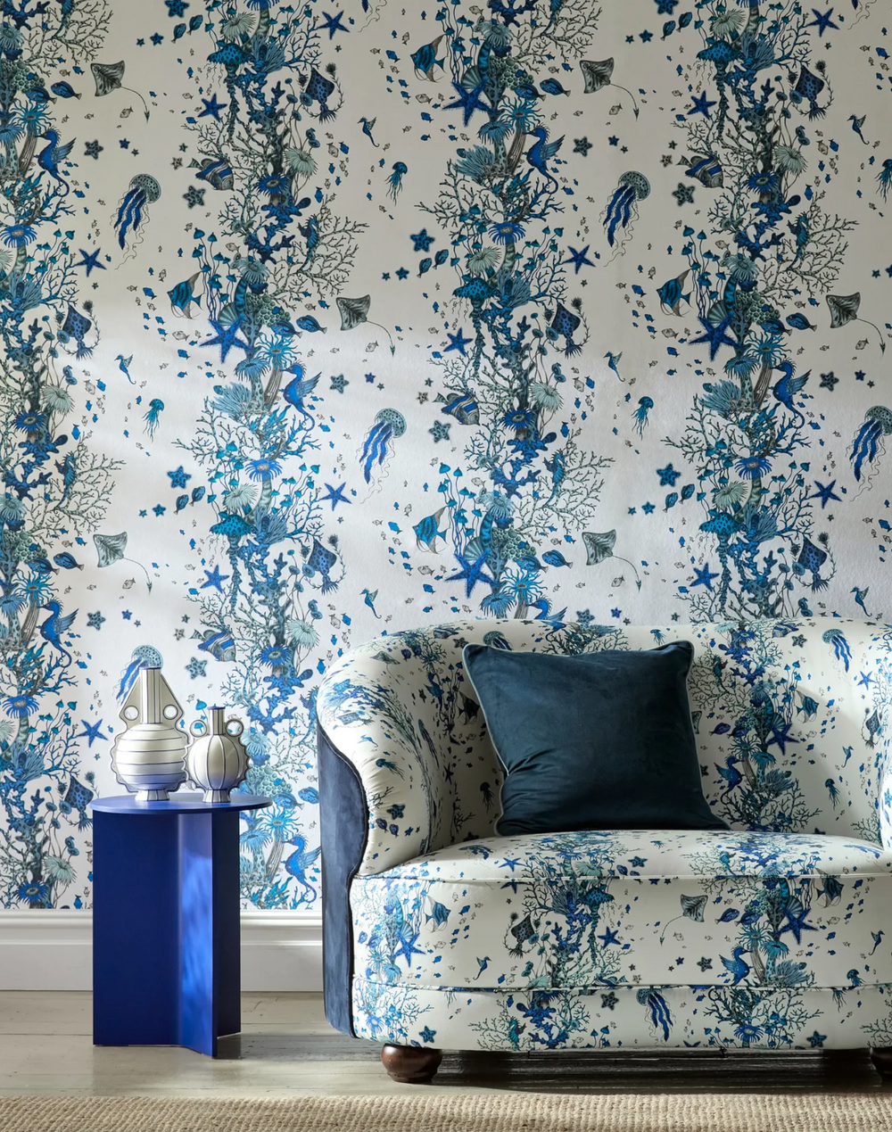 The Amazon Wallpaper is part of our magical Animalia collaboration with interior experts Clarke & Clarke. This design is inspired by the jungle scenes in the Amazon, featuring jaguars hidden amongst the foliage and playful parrots in the trees. Channel exotic maximalism with this vibrant color way, rich with opulent shades of blue and teal with a contrasting splash of orange, the perfect way to turn your home into a maximalist dream.
