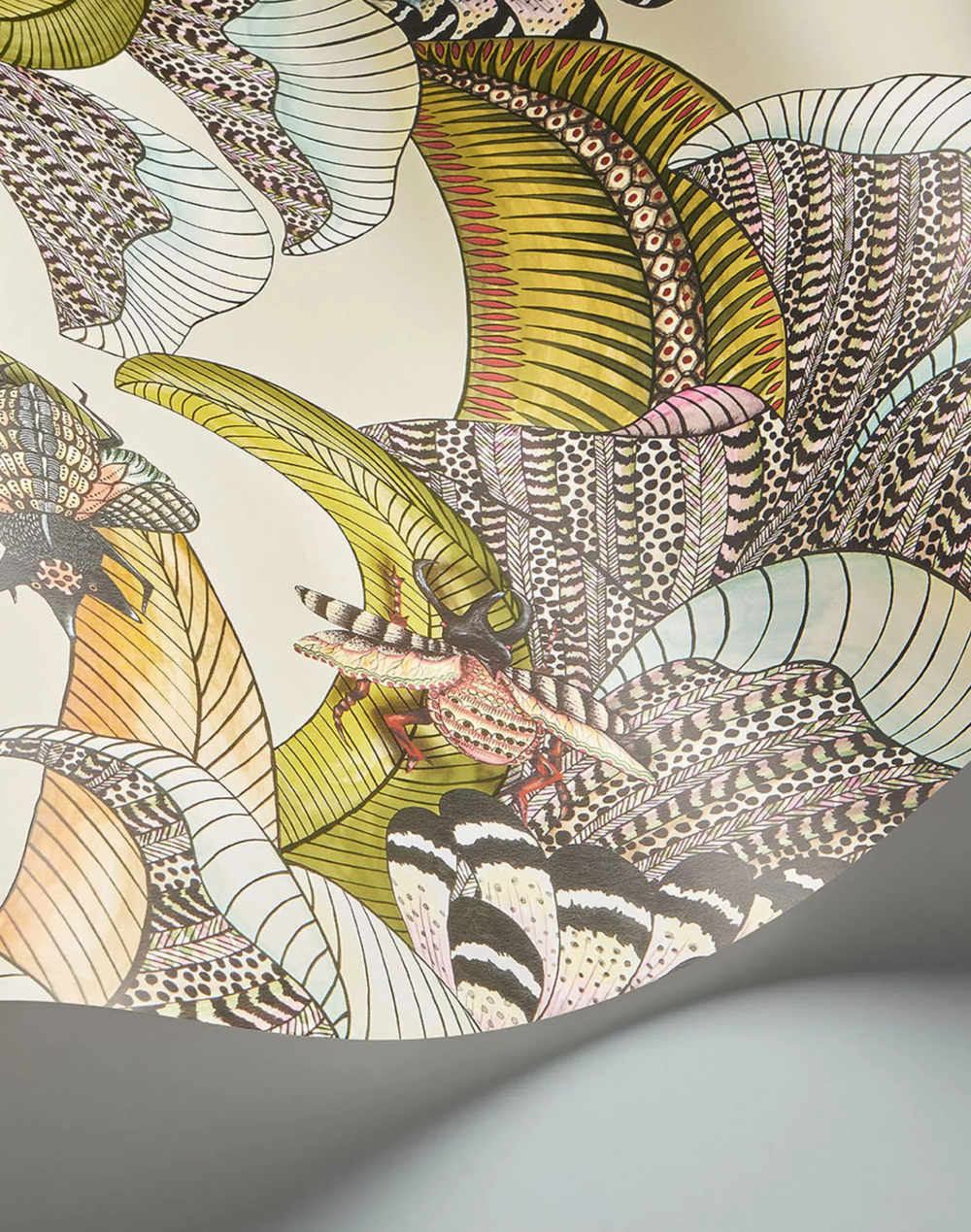 Leaves, fronds and flowers form a lush and peaceful labyrinth within Hoopoe Leaves canopy; a closer glance revealing nature's bustling wonder. What appear to be blossoms are, in fact, the feathery crowns of exotic Hoopoe birds hiding in the foliage alongside wildly embellished beetles and a wide-eyed praying mantis. Every leaf, feather and insect wing is lovingly adorned with intricate patterns evoking Zulu beadwork.