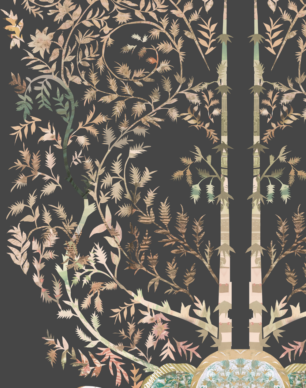 An exotic floral wallpaper created by Chinese artist Xin Song, who works in the medium of collage and found imagery. Song sources her materials from disposable media culture, allowing her to interweave messages about social and political upheaval into her delicate artworks.