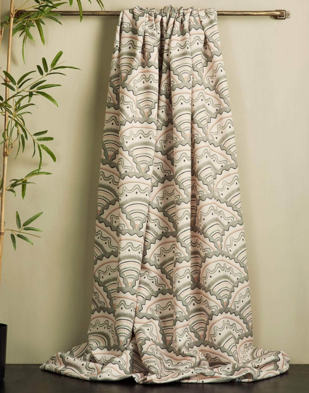 The 1930s-inspired design Clarice is somewhat evocative of ceramicist Clarice Cliff. It has distinctive scallops, painterly zigzags, and wiggles in a herringbone weave fabric in shades of sage green, subdued orange, and velvety black. This is a multi-purpose polyester herringbone that has the appearance of linen but does not fade.