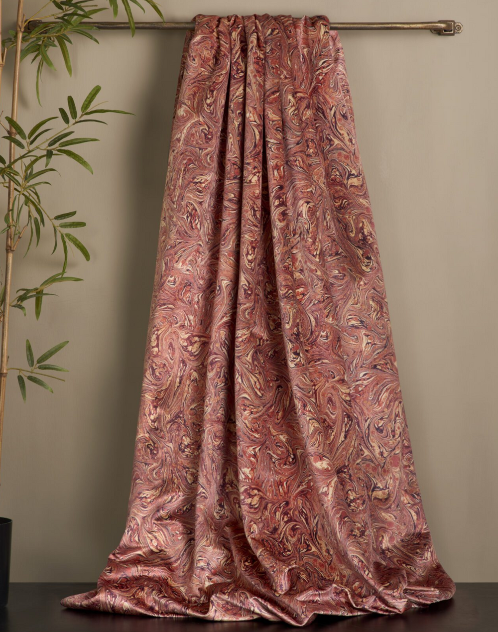 Meredith is the result of our incredible partnership with Marbling Artist Freya Scott. We were captivated by this captivating, incredibly clever, and confidential method, which inspired us to create this fabric with a marbled pattern. Our velvet is hessian backed for strength and still drapes sufficiently for lightweight use due to its short pile, making it suitable for cushions, curtains, and upholstery.