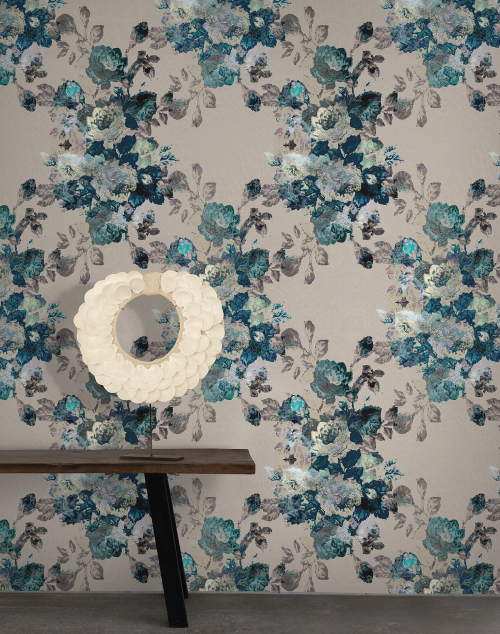 A delicate lace background weaves its way through a trellis of roses. A modern floral wallpaper classic, inspired by vintage rococo patterns found during a renovation.