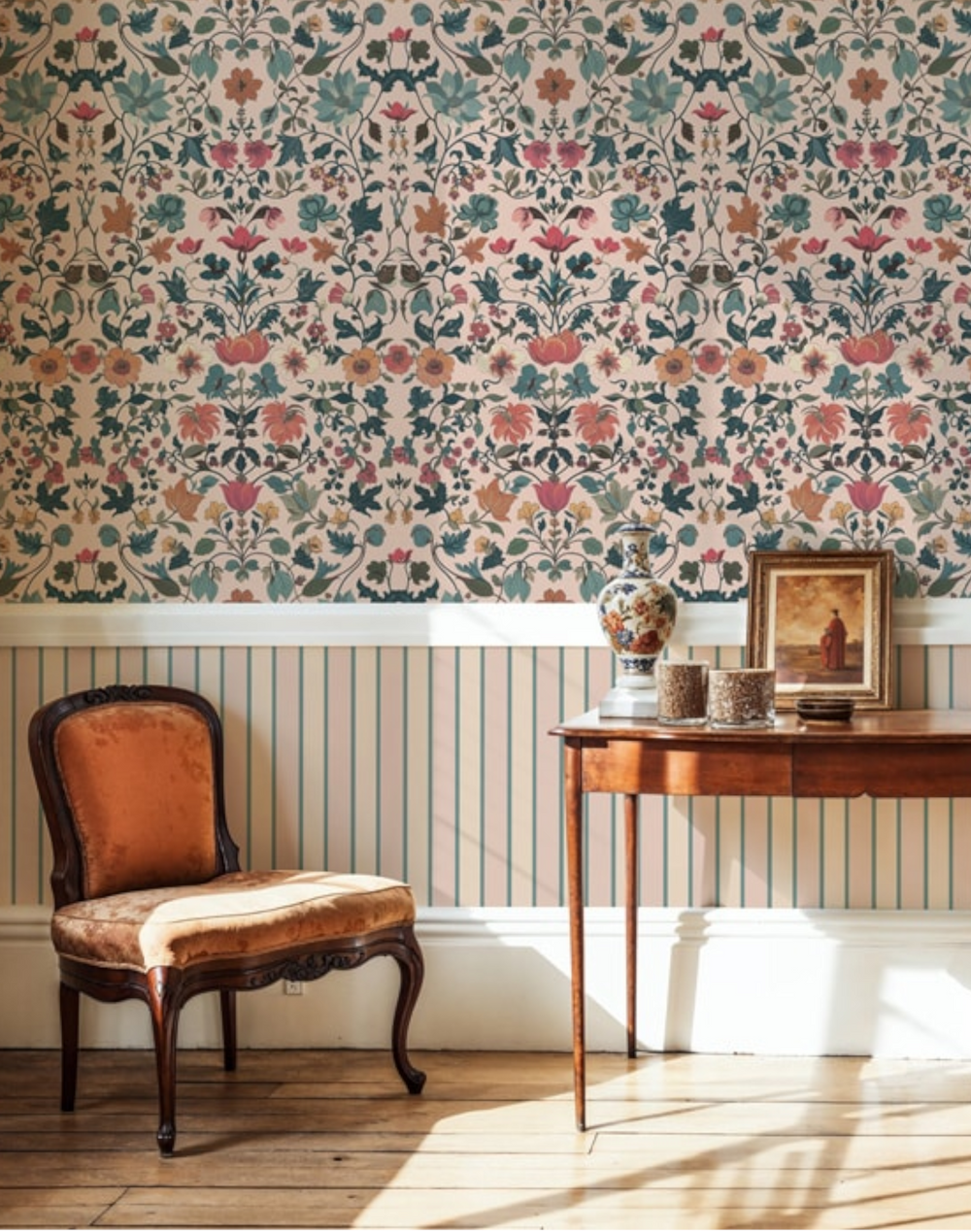 Discover Bocage Pink, a beautiful floral pattern wallpaper that draws inspiration from the Arts & Crafts movement and reimagines this timeless interior design style for the modern home. This elegantly playful design is part of a collection created in collaboration with Lily Sawyer Interiors. The Bocage wallpaper features a balanced and structured composition of floral motifs, with the Pink color variant using warm blush pink tones to provide the setting for subtle pastel florals. With its reimagining of the Arts & Craft movement, this floral wallpaper is perfect for modern or traditional interior design schemes.