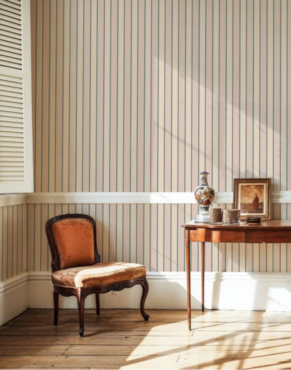 The Bocage Stripe Pink wallpaper elegantly combines simplicity with sophistication. Bocage Stripe enhances the room’s dimensions and height, making it an excellent choice for both traditional and contemporary settings. Whether used as an accent or a feature wall, this pink & cream classic stripe wallpaper integrates seamlessly with various interior design schemes, providing a backdrop that complements both bold and understated decors. This classic ticking stripe wallpaper is part of a stunning new collection created in collaboration with Lily Sawyer Interiors, with Bocage Stripe Pink conceived to be coordinated with the Bocage Pink floral wallpaper.