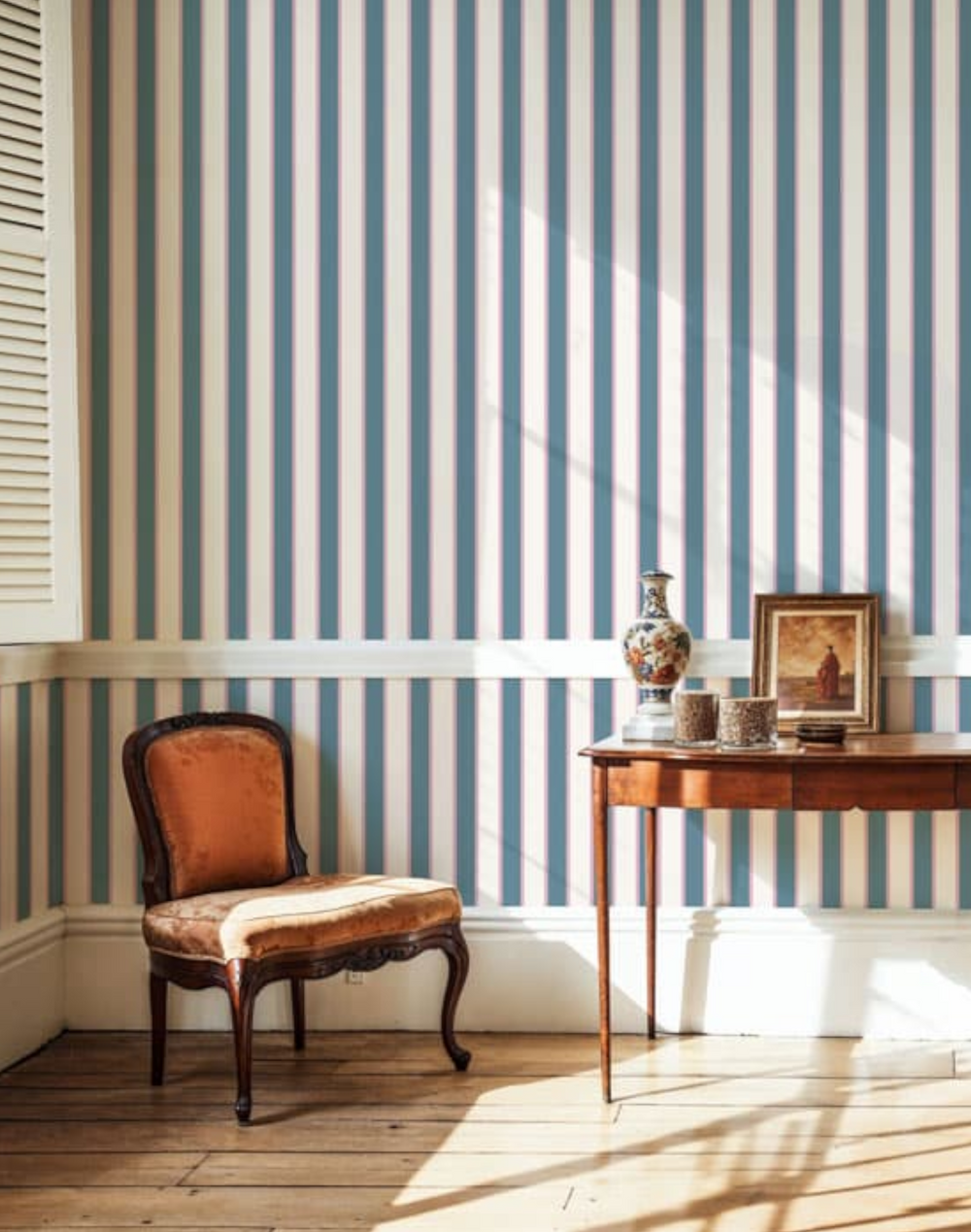 The Bocage Stripe Teal wallpaper elegantly combines simplicity with sophistication. Bocage Stripe enhances the room’s dimensions and height, making it an excellent choice for both traditional and contemporary settings. Whether used as an accent or a feature wall, this teal & white classic stripe wallpaper integrates seamlessly with various interior design schemes, providing a backdrop that complements both bold and understated decors. This classic ticking stripe wallpaper is part of a stunning new collection created in collaboration with Lily Sawyer Interiors, with Bocage Stripe Teal conceived to be coordinated with the Bocage Teal floral wallpaper.