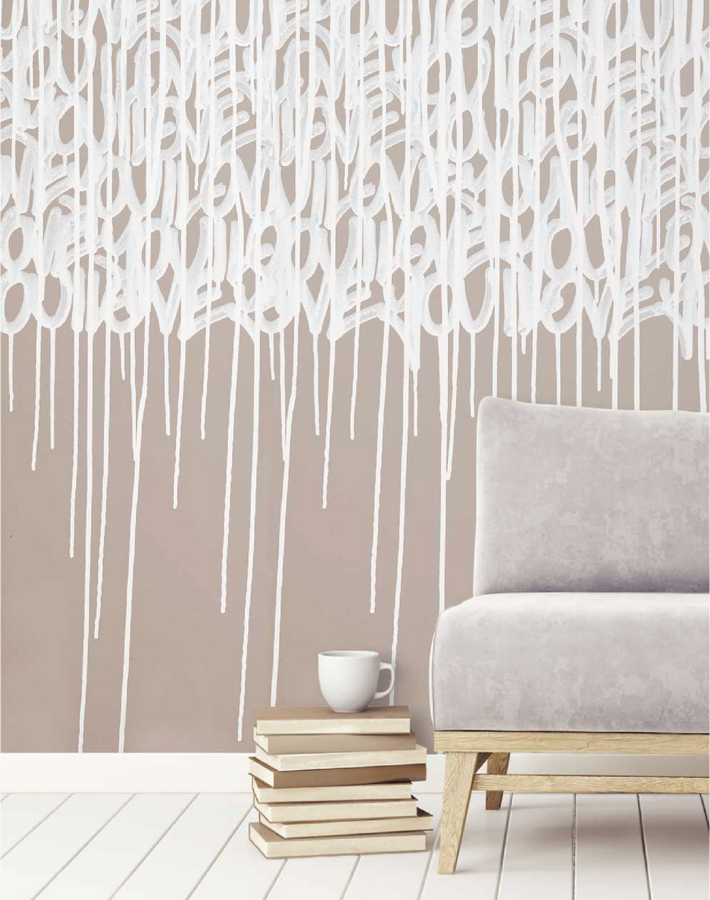 The Enlightened Love graffiti wallpaper has been created by Los Angeles artist Amber Goldhammer.  Mixing a soft palette of colors with the organic flow of her graffiti tagging, it's subtle and beautiful way to bring street art into the home. Amber's trademark positive messages of love and hope can be seen on the streets of LA, as well as hung as canvases and wallpapers all over the world.