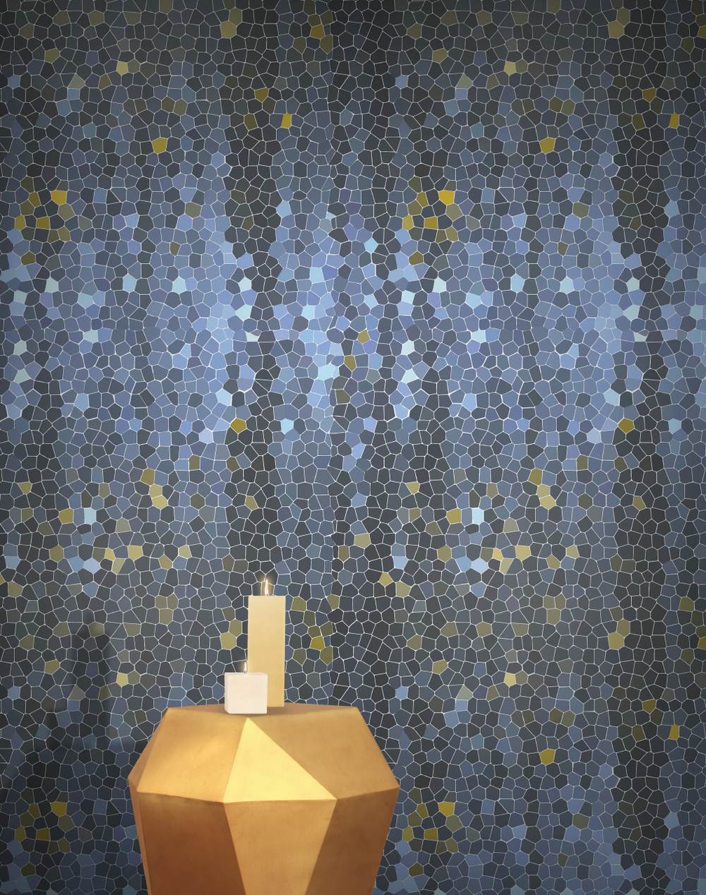 When creating this piece, Chinese artist Yuexin Du recalled the summer nights of her childhood - dark forests full of light from fireflies. By using a subtle mosaic, she captures this memory in a shimmering waterfall of light and movement.