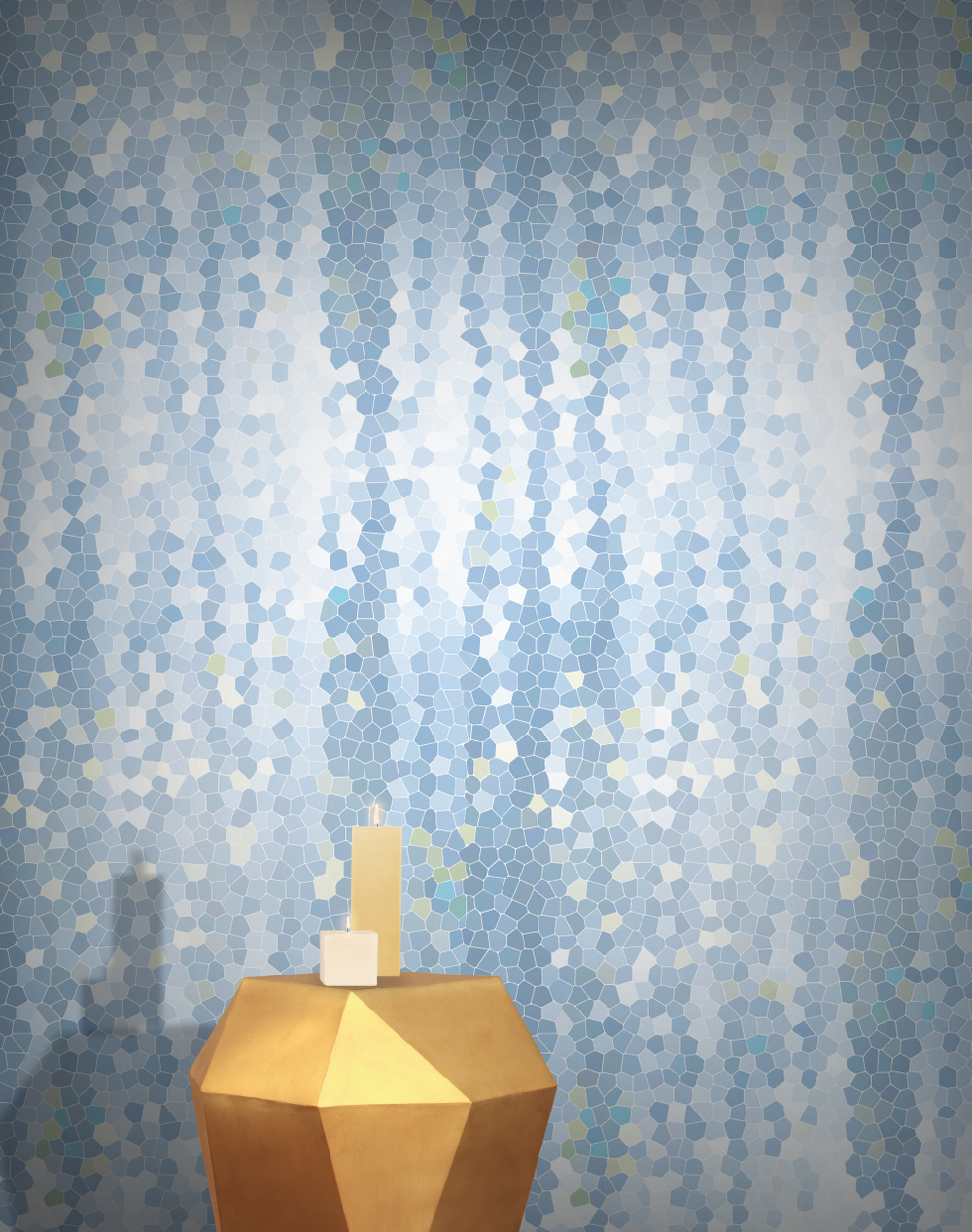 When creating this piece, Chinese artist Yuexin Du recalled the summer nights of her childhood - dark forests full of light from fireflies. By using a subtle mosaic, she captures this memory in a shimmering waterfall of light and movement.