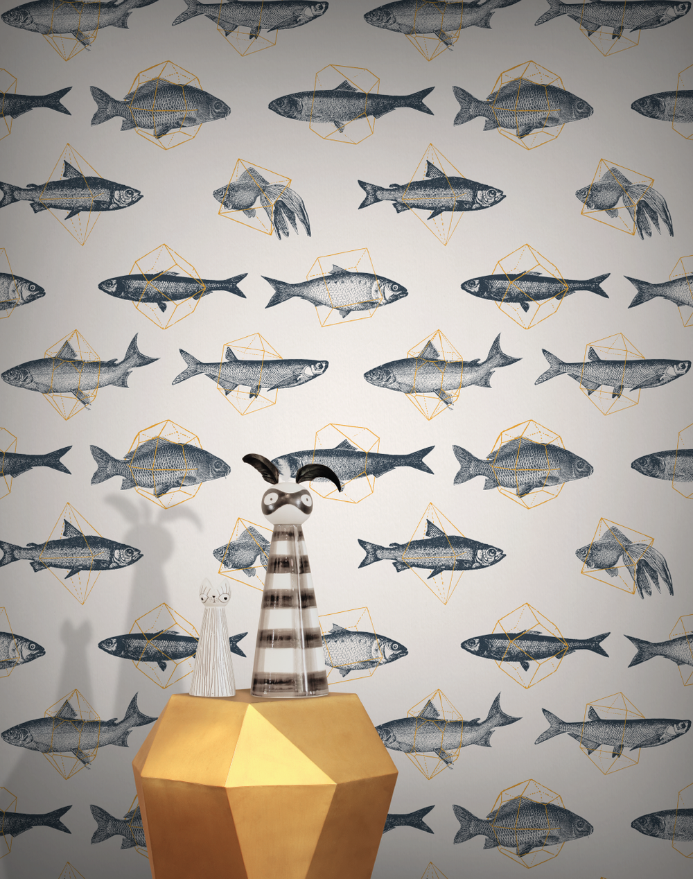 A striking modern designer wallpaper, built around fish trapped in geometric shapes.
