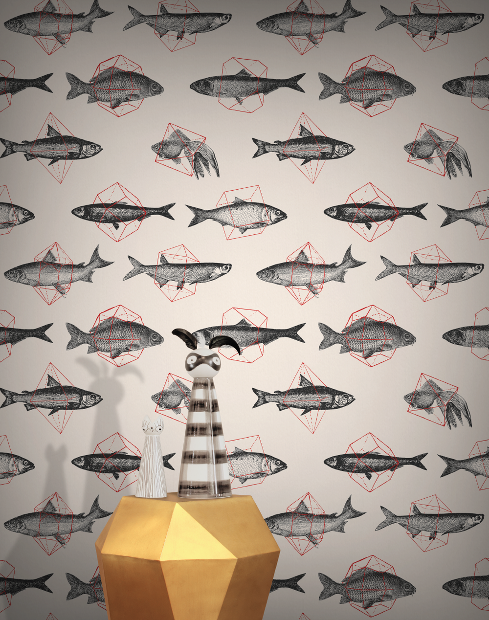 A striking modern designer wallpaper, built around fish trapped in geometric shapes.