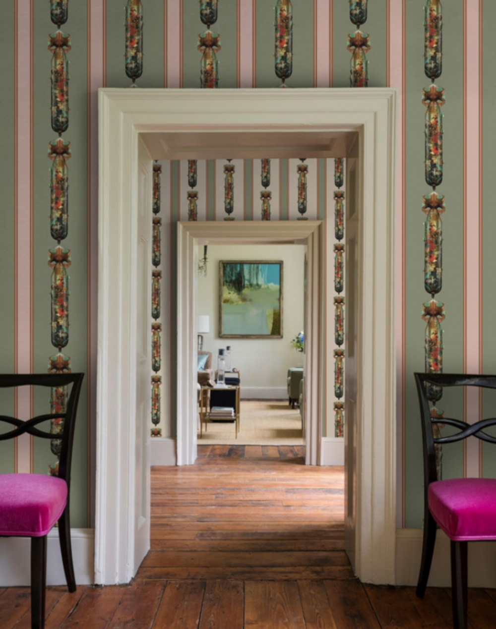 The Flower Bomb wallpaper brings a touch of black humor to the formality of a Georgian striped wallpaper. The design remixes a stylized bomb with classical motifs and in doing so reminds the viewer that the extremes of human existence - love and hate, war and peace, light and darkness - so often go hand in hand.