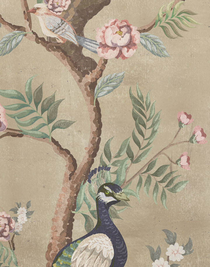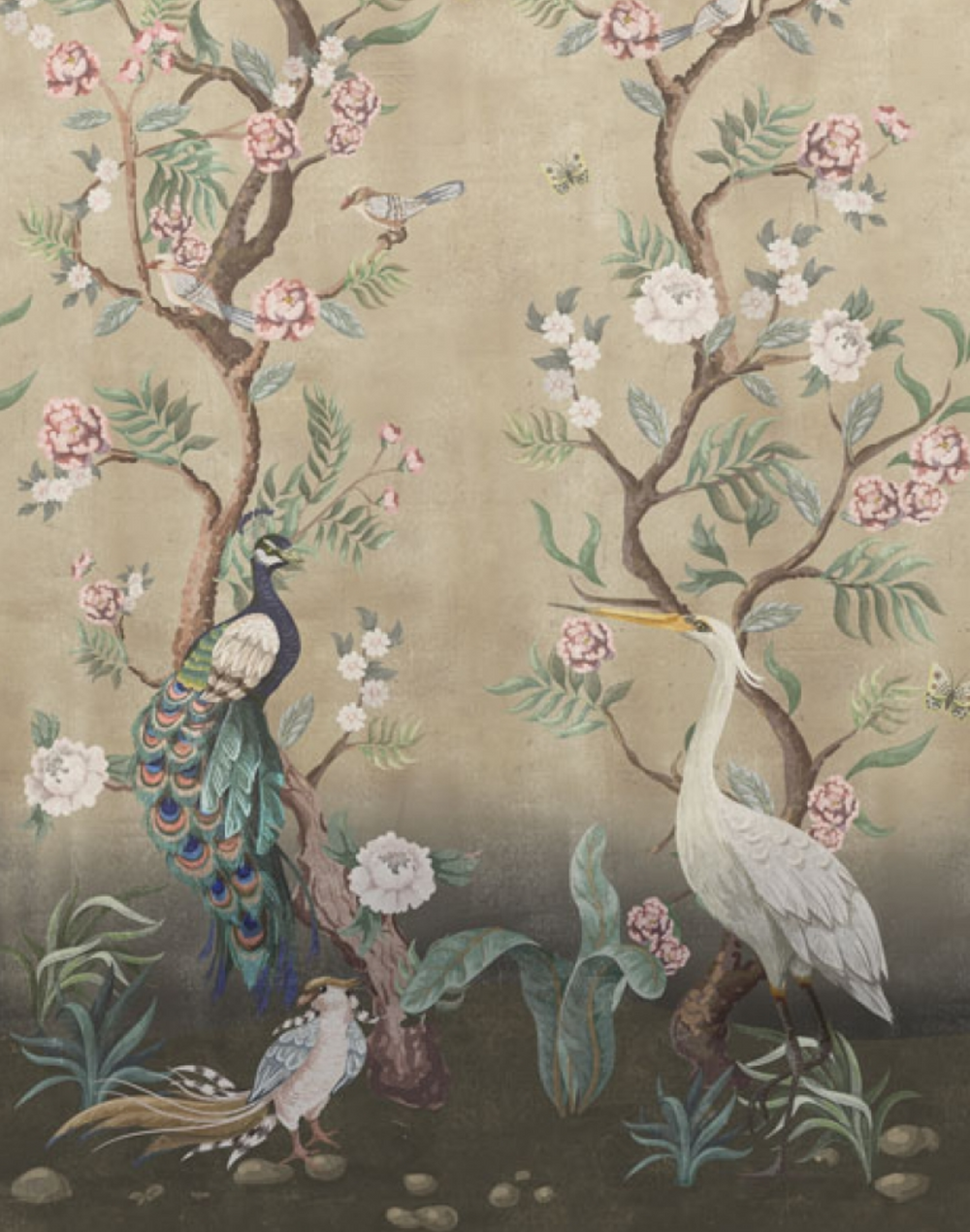 A stunning new Chinoiserie wallpaper, featuring exotic animals and cherry blossoms climbing a subtly distressed wall.
