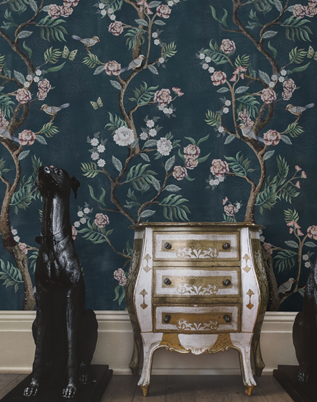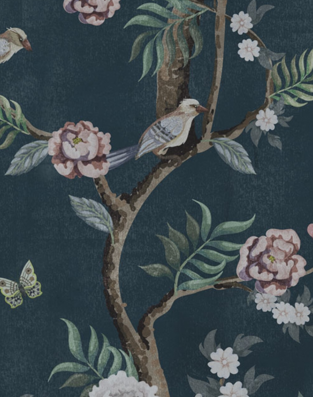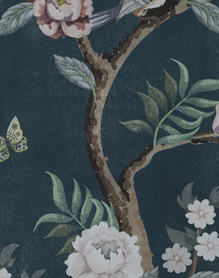 An exotic and romantic Chinoiserie wallpaper, with a stunning distressed texture and beautiful detailing.