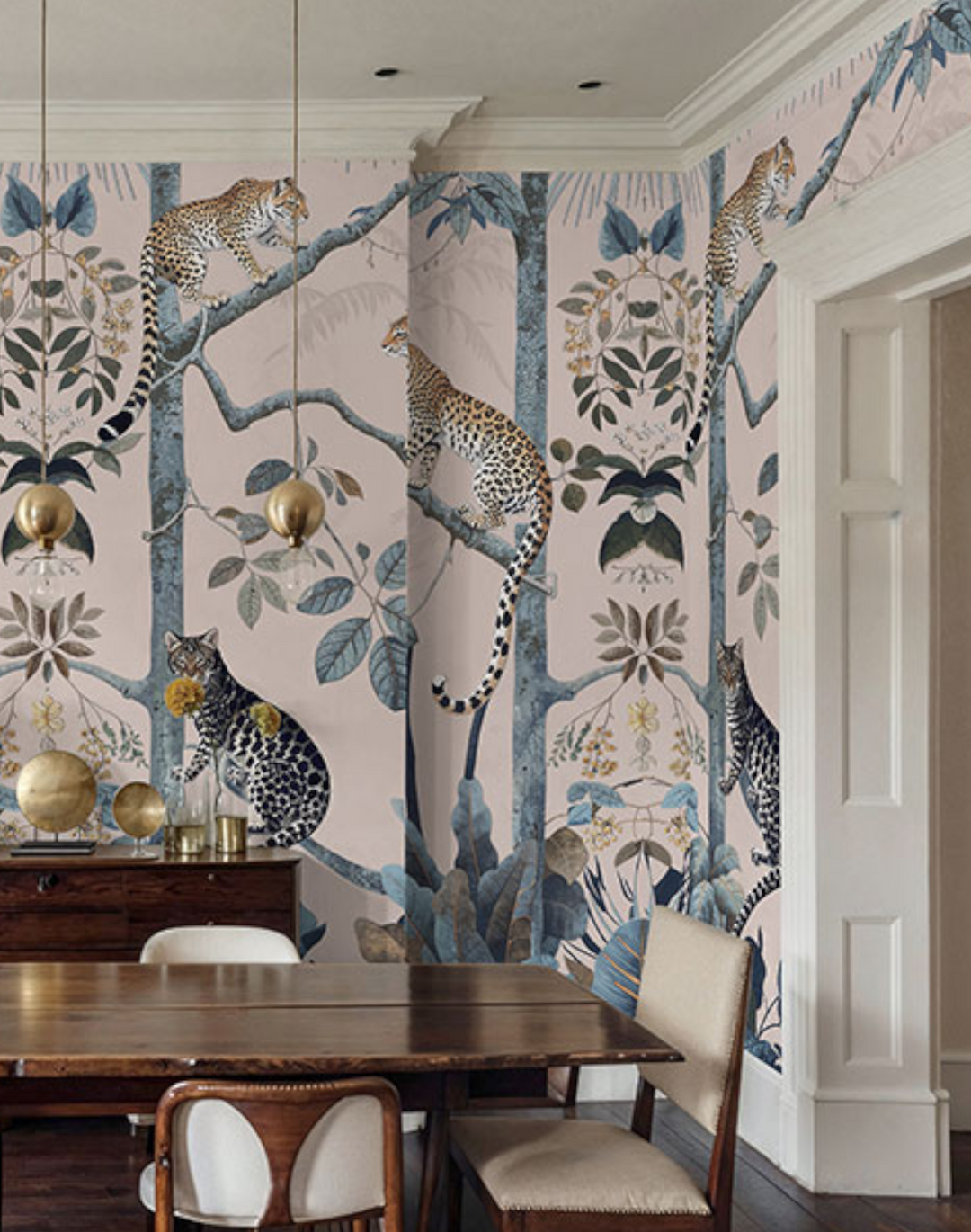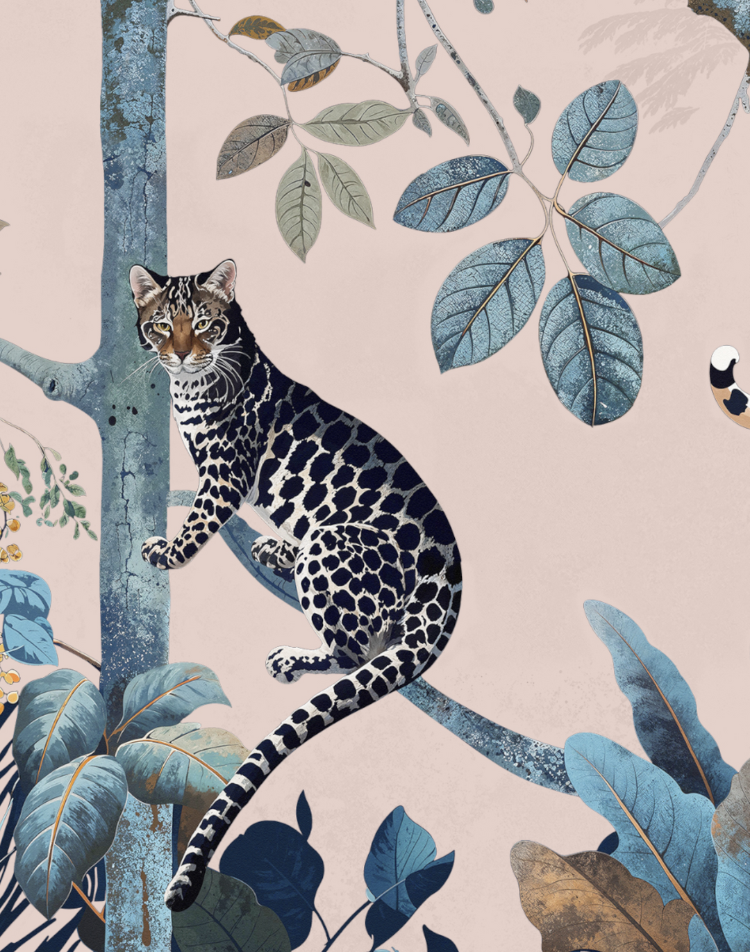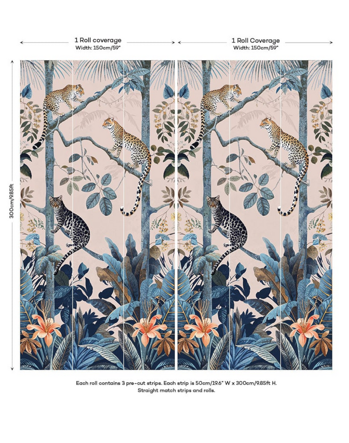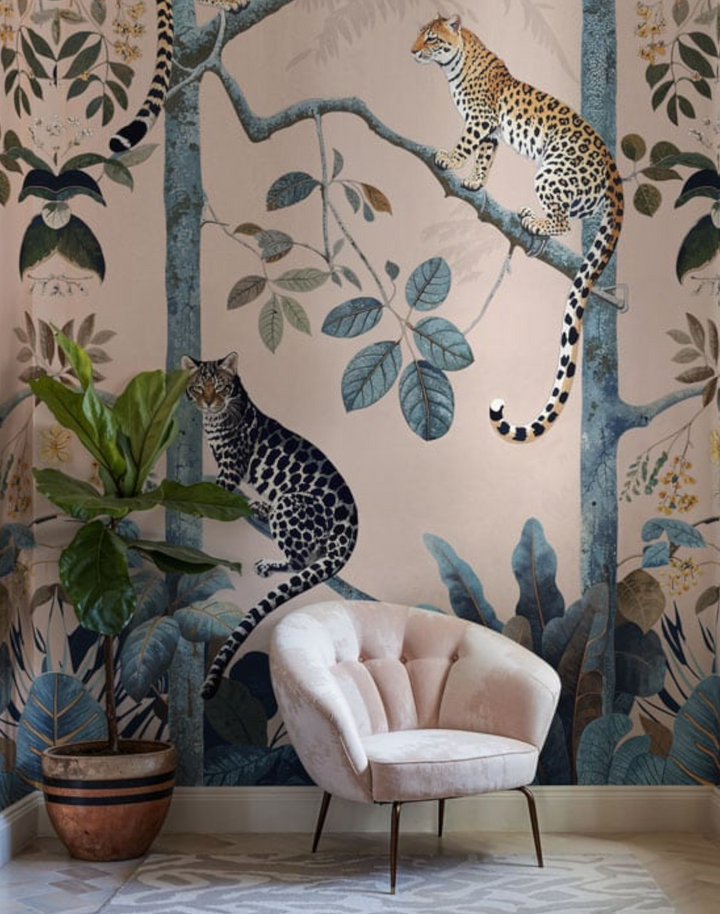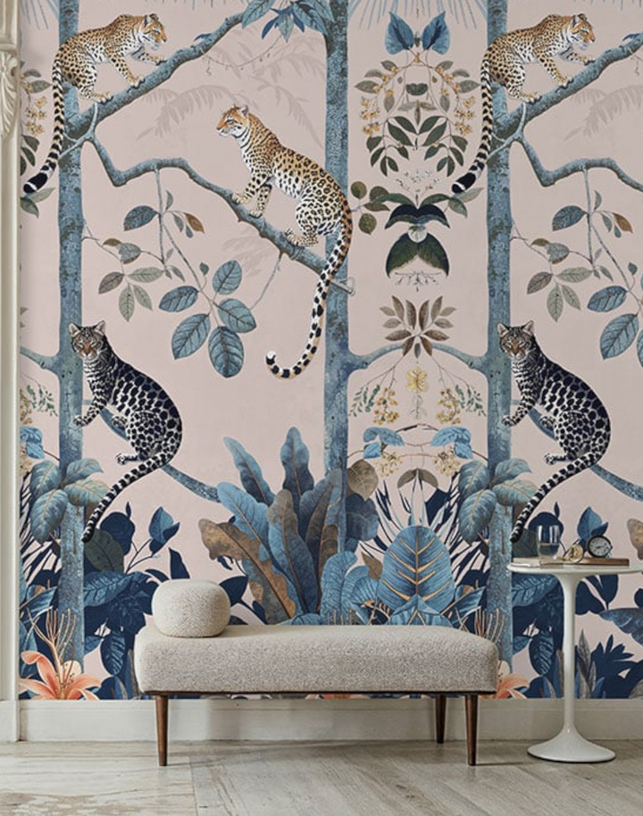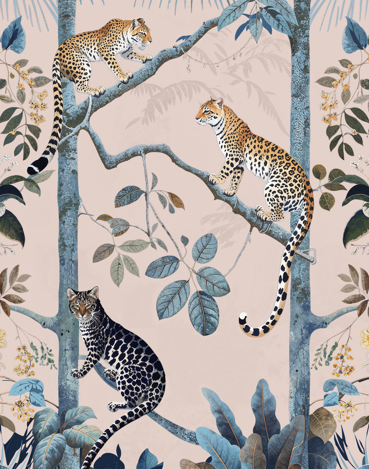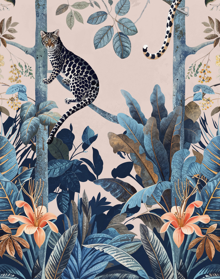 Transform your space with “Panthera Pink,” the quintessential pink leopard wallpaper that exemplifies the allure of tropical jungle wallpaper. Each stroke of this exquisite piece reflects the utmost attention to illustration detail, ensuring a premium quality that resonates with the discerning eye. The “Panthera Pink” pink leopard wallpaper boasts a lush, vibrant ecosystem, inviting a touch of the wild into sophisticated and transitional interiors alike. Its composition—a symphony of blush tones and serene blues—suits a myriad of interior design schemes, from the avant-garde to the classic, making it a versatile choice for those who covet a statement wall that’s as timeless as it is trendsetting. Embrace the jungle with our pink leopard wallpaper to infuse your environment with a chic, botanical ambiance that’s enduringly stylish.