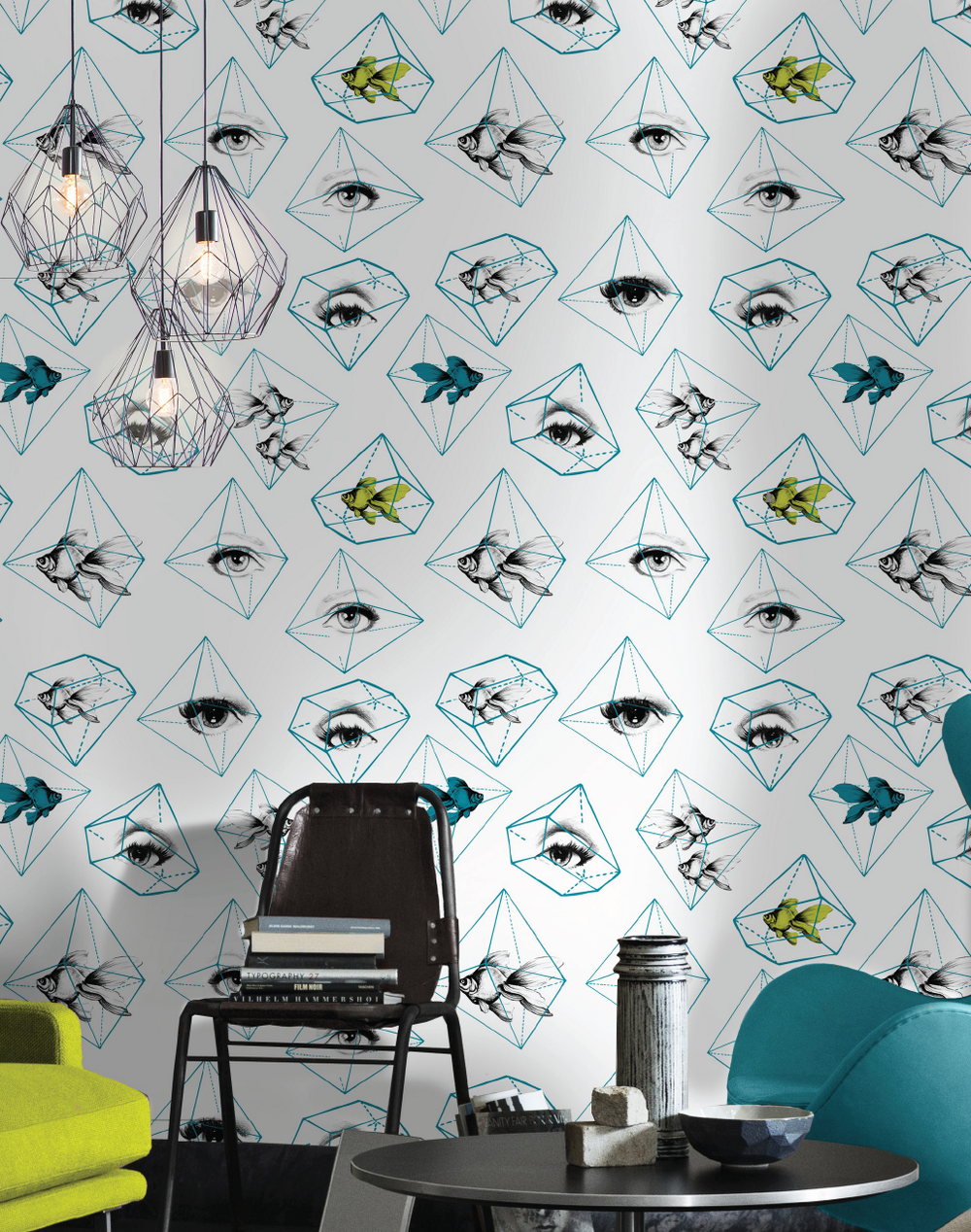 Hand-drawn eyes and goldfish float through space in geometric shapes.