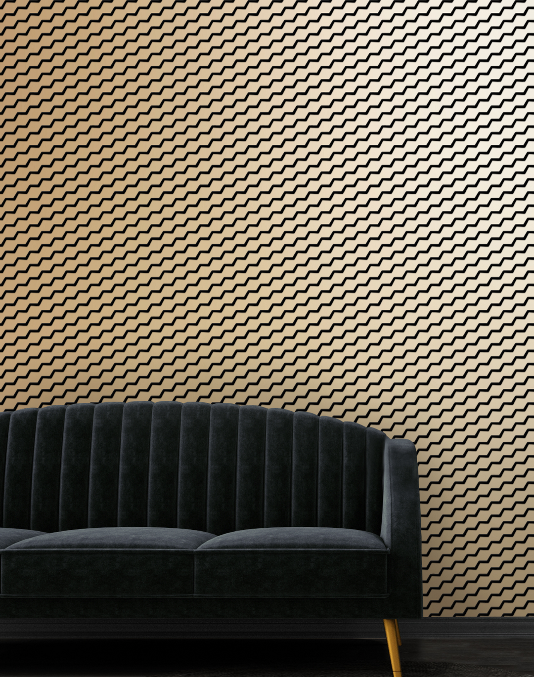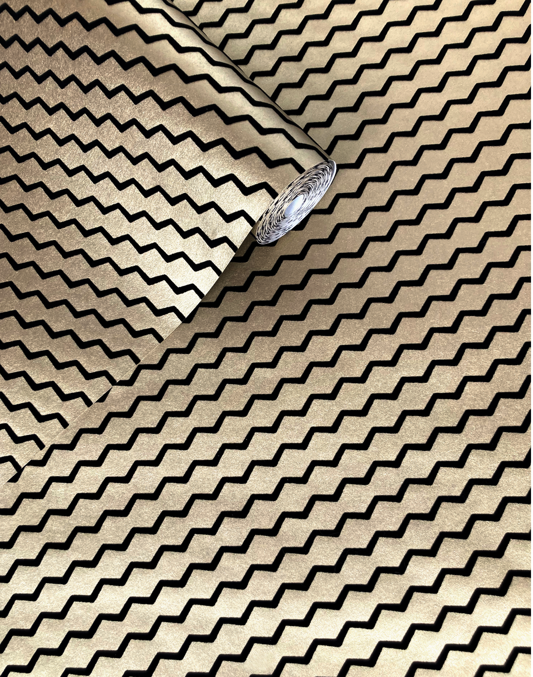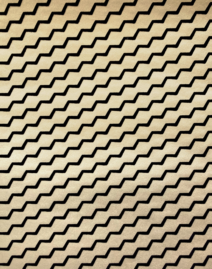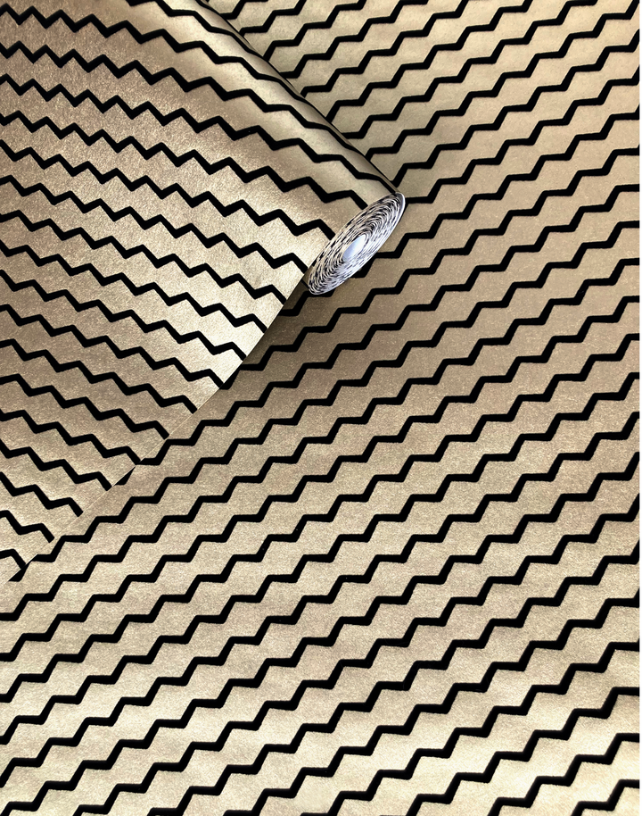 A chic black flock wallpaper design, on a heavy weight gold ground