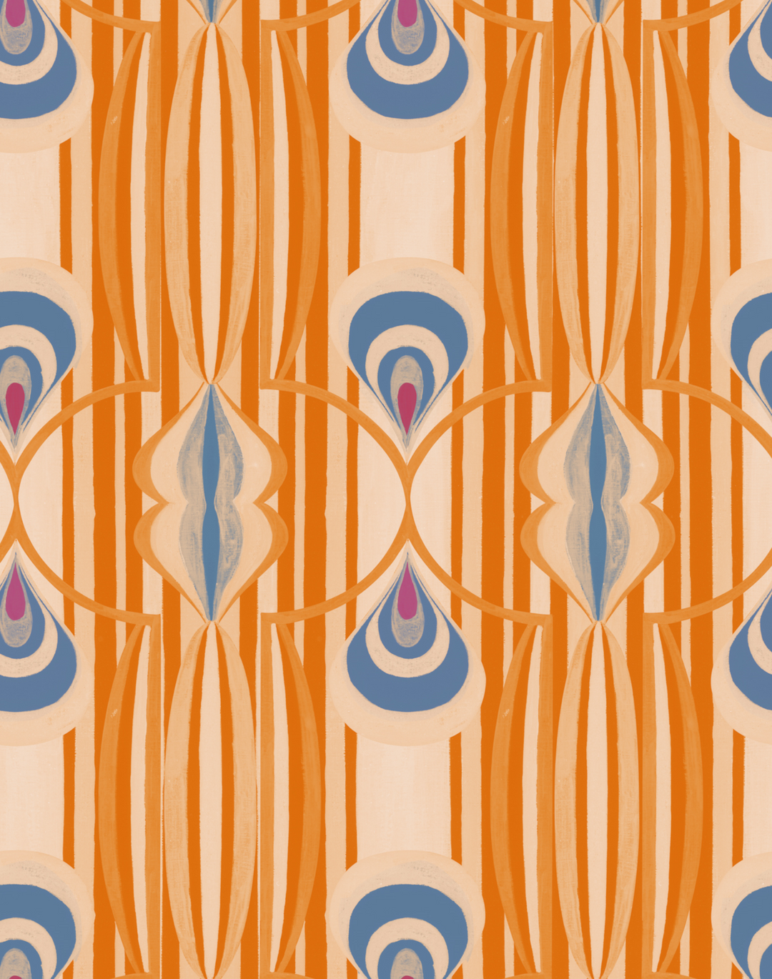 An eye beckoning design that seamlessly blends retro-modern charm with abstract geometric motifs reminiscent of the iconic styles of the 60s and 70s. Each design exudes a nostalgic aura, featuring dynamic patterns and vibrant colors that pay homage to the vintage aesthetic of yesteryears. Transform your space with these evocative backgrounds, where geometric shapes intertwine to create a captivating visual narrative that transcends time. Available in a curated array of three exquisite hues combination, including rich tones of blue, sumptuous blends of orange, and delicate shades of light blue, this design bestows an ambiance of refined chicness to any interior.