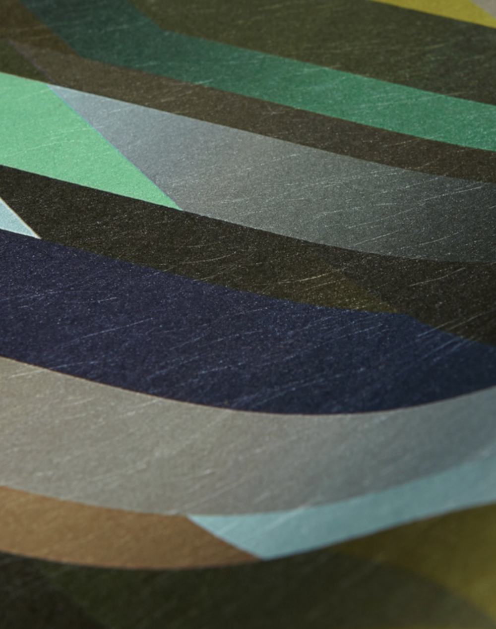 Diagonal Gradient is a visual interpretation of light-speed travel. A series of shards chase and gain on one another across sharply angular diagonal paths. Some shards are saturated colour blocks, others are graded, fading from light to darker hues. Strikingly futuristic in its dazzlingly complex intersection of pattern and color, the design draws on ancient traditions in a juxtaposition that has come to characterize the studio’s vision. The energetic, linear graphic reads as a modern take on tartan, as this intergalactic, near psychedelic design invigorates any space.