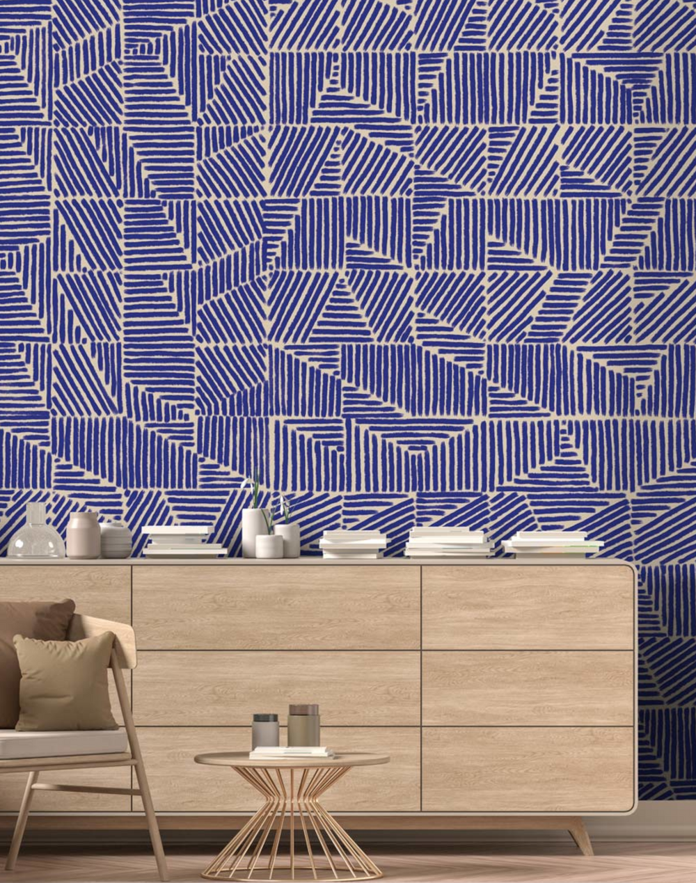 "Moonlight Eclipse" is inspired by the wonder of the moon and the promise of dreams. Featuring midnight blue hues on a cloudy beige background, it is easily adaptable to any space.