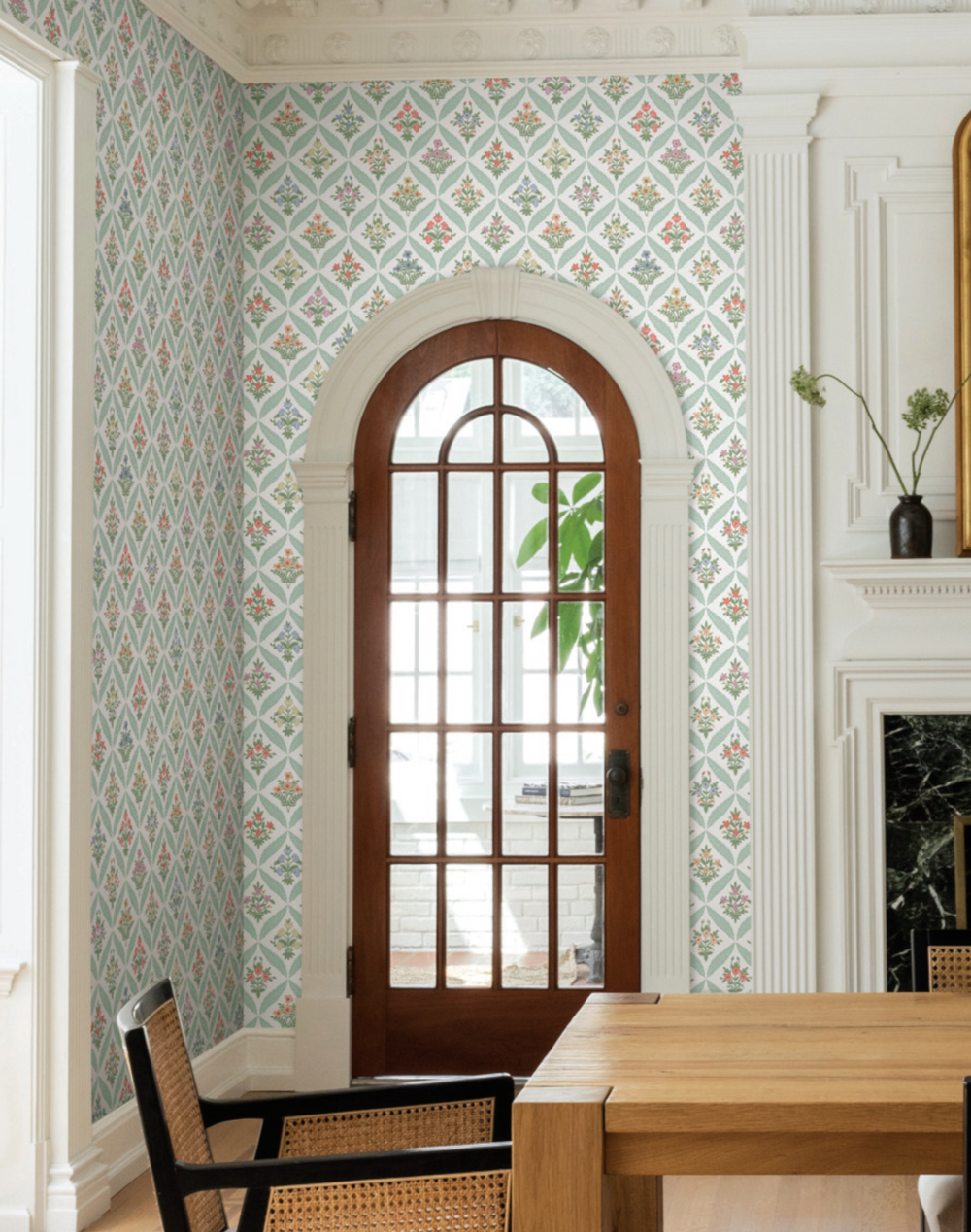 Filigree leaves create a crosshatch grid filled with botanicals on our Estee Garden wallpaper.