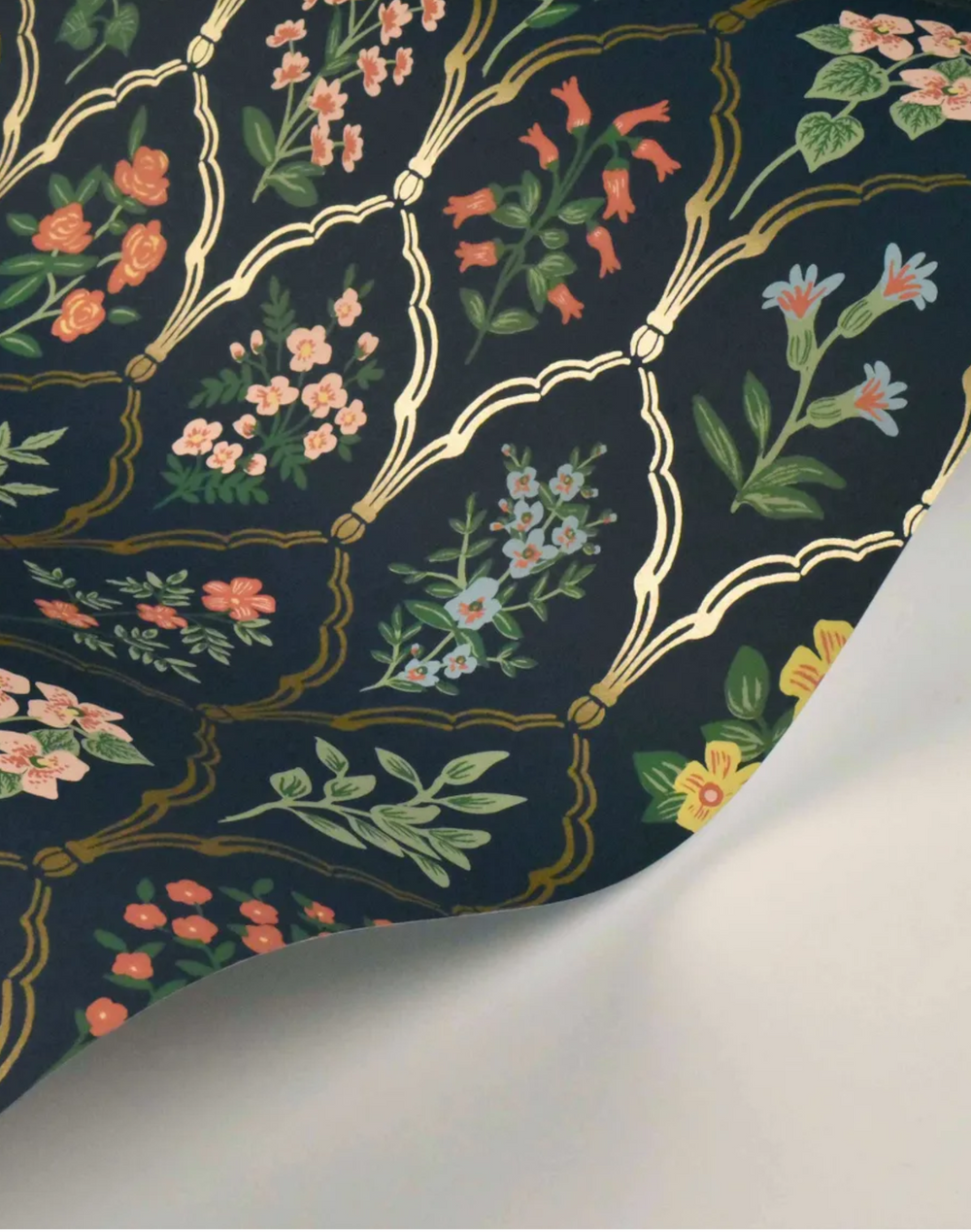 Hawthorne features sprays of assorted flowers standing under delicate arches that create a botanical grid with a vintage feel. This wallpaper is screen printed and comes in 27 inch rolls with a 25.25 inch repeat.