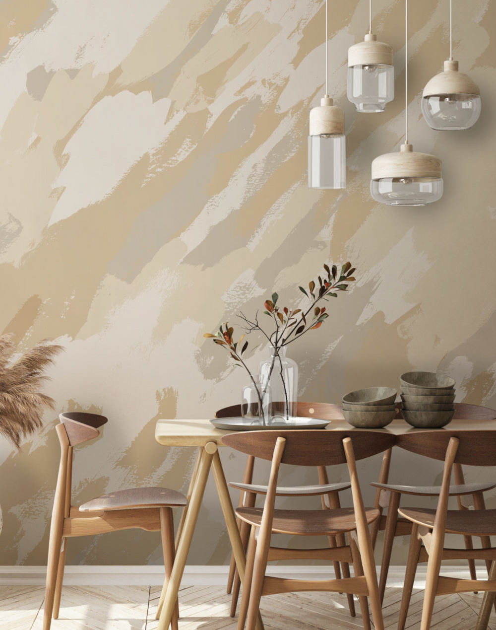 "Heliophile" is inspired by magnetic embrace of the sun. Featuring sunny beige, yellow and white brushstrokes, it conjures feelings of warmth and joy in every space.