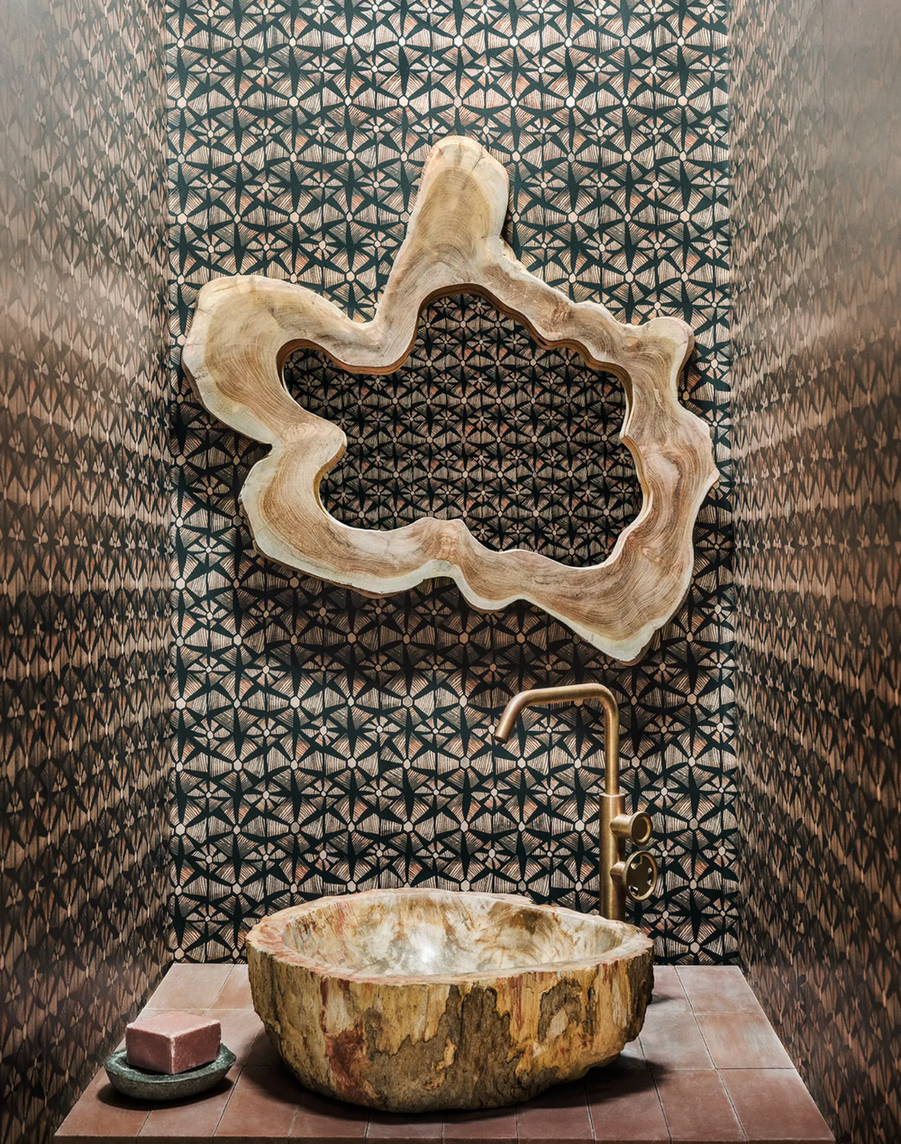 Elevate your space with Ardmore's Kalahari Wallpaper, where sophistication meets the mystique of the African landscape. This exquisite design features a harmonious blend of spiced browns, cool neutrals, and lush greens set against an ebony backdrop, inspired by a stylized tortoise print. Its geometric burst pattern, reminiscent of a tortoise's shell, adds a contemporary and rhythmic touch. Perfect for creating a warm, inviting atmosphere with an elegant, African-inspired twist