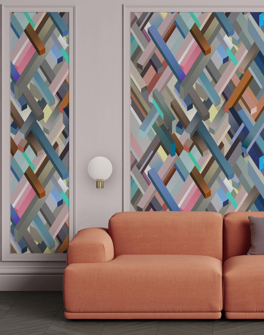 Kubrick expresses the hyperreality of the iconic director’s pioneering aesthetic. Extruded, gravity-defying geometric forms traverse the paper, criss-crossing with striking angularity. A play of exuberant and muted colours – some block, others ombre – heighten the sense of movement as these intersecting objects push through space. Inspired by the1968 classic, 2001 A Space Odyssey, the dynamic drama of this design imbues a space with a cinematic quality, suggestive of a rushing, ceaseless metropolis.